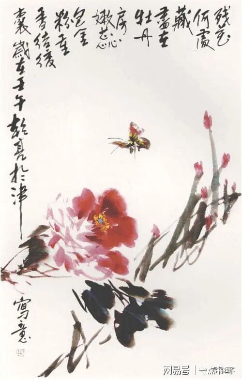 顺锋:顺手方向,即自左向右,自上而下,都叫顺锋。画中的牡丹头与自左向右的叶子都是顺锋画出,而自下而上的枝杆,则是逆锋画出。
