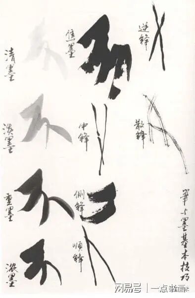 藏锋:起锋时折锋把笔的锋尖藏于笔画的中间,结束时,顿笔、回锋,把笔的锋尖藏于笔画之内。例如图中梅花的画法,枝条的勾描和梅花的点厾,用的都是藏锋的方法。