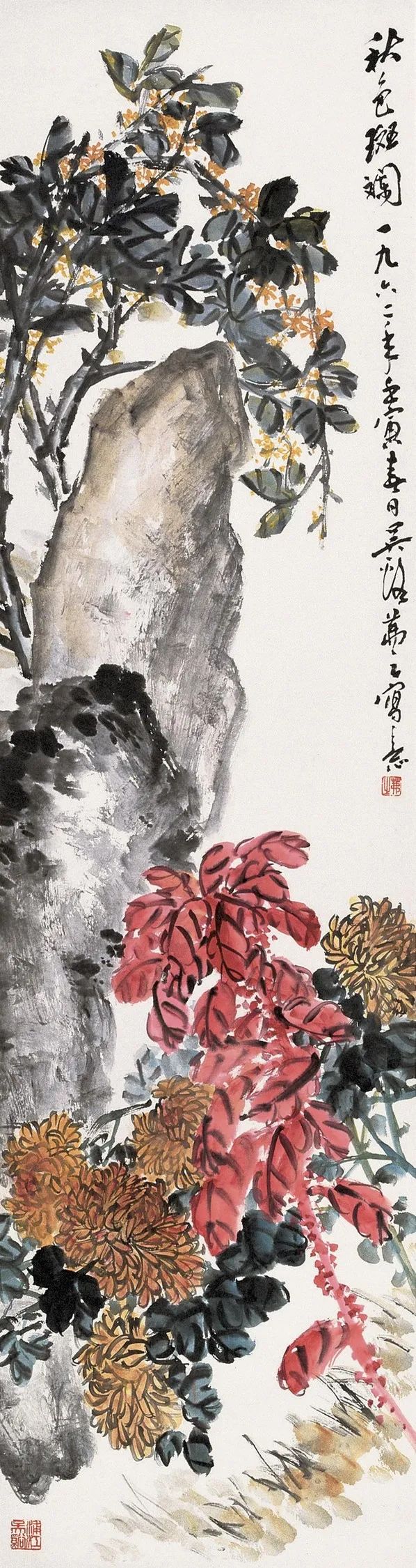色破墨,就是适当掌握好墨色干湿时候,及时用色笔进行点破。此法最好用厚色、或矿物色。任伯年善于使用此方法,描绘绿色孔雀。如其光绪庚辰年所作的《牡丹孔雀》,就是先用墨写出孔雀的神态,然后在墨色未干透时,用石绿破墨色,使色与墨相互渗化融成一体。当今人们画翠鸟、公鸡、绵鸡等,常爱用此方法。以表现所描绘对象羽毛的厚重。墨托色浑原、丰富。吴双的《秋菊图》,就是先以墨勾花朵,然后以色进行填补(色破之);刘海粟先生的《莲荷》,荷叶重色破墨;裴玉林先生的《雨林晨风》,也是采用此方法,所描绘的花木丰润感强。