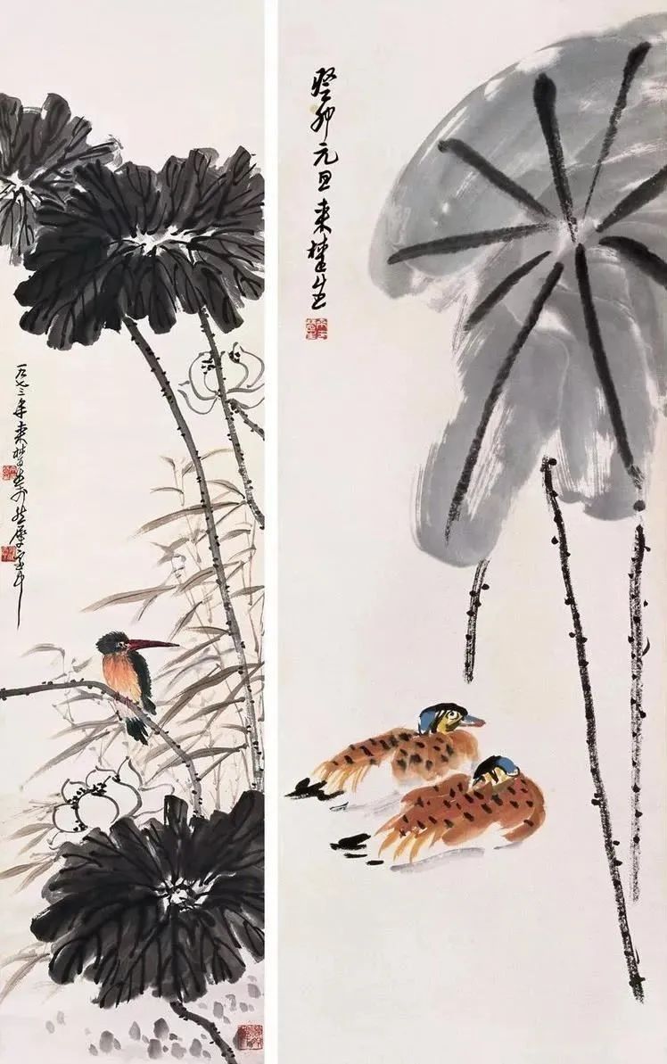 水破墨,与墨破水是相反的方法,在花鸟画上,表现出相反而且相成的效果。水破墨表现的效果丰富;墨破水表现出的效果厚重不板滞。如早晨时分的花木树叶,可以用水破墨;表现午后晚秋时的花木树叶,可以用墨破水。我经常在画晨时芙蓉花叶时,爱用水破墨;画雨雾中的牡丹时,也爱用此法。达到即清即朦的效果。画秋时湖鹭、栖在芦苇旁的芦苇用墨破淡(水色)。冯今松先生的《红莲斌》,就是采用此方法,用带色的水笔,破勾画的荷叶,使荷叶朦胧感强,而且笔触若隐若现,浑然一体。感观效果非常清新。