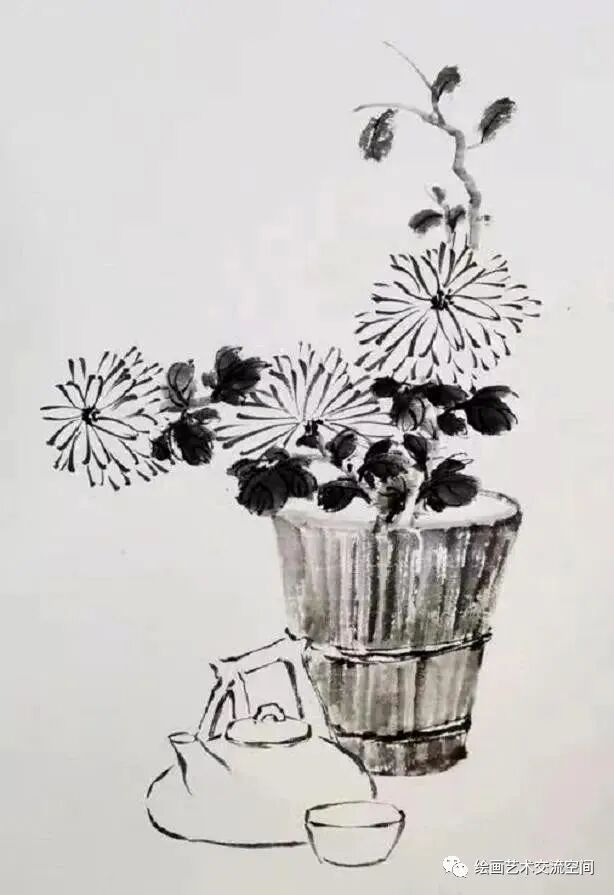 第三步:补上菊花的叶和安置的器物。注意整体的浓淡变化。