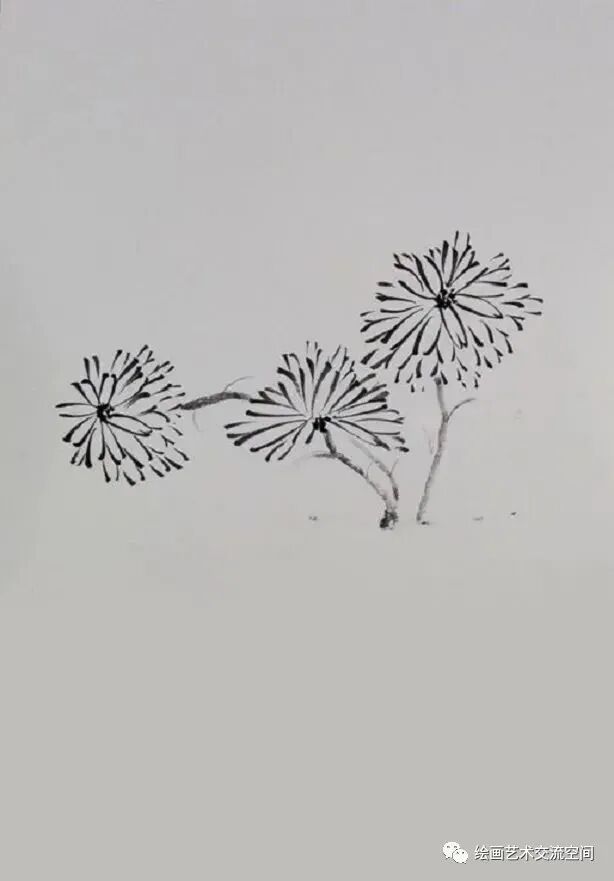 第一步:用墨勾出菊花的大轮廓,注意构图安排。