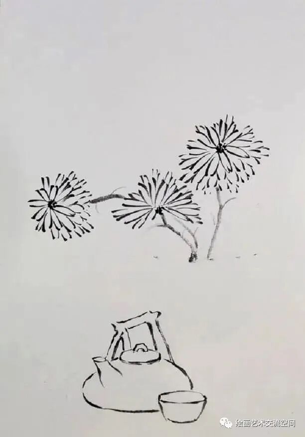 第二部:勾出菊花后,下部勾出茶壶和茶杯,注意造型简练准确。