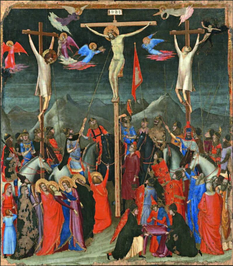 出于一次偶然的看画经历,在卢浮宫的“早期文艺复兴绘画”厅,作者注意到一幅14世纪那不勒斯的《耶稣受难》。它并不是名家的作品,甚至连画家的名字也无从考证,关键人物耶稣和两位盗贼面部的涂层已经变得斑斑驳驳,但在构图和细节上却颇有新意。
