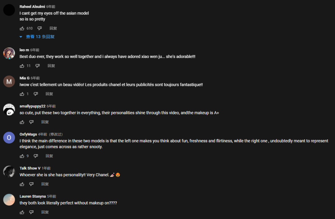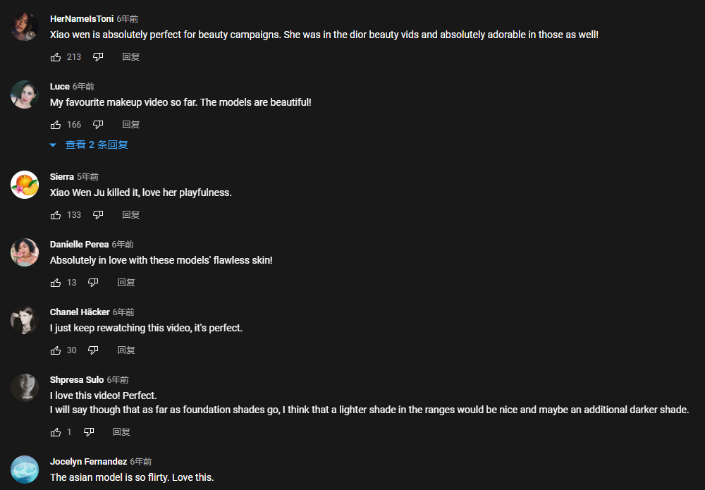 在该条 Youtube 视频的底下,大家也纷纷表达了对雎晓雯这一“亚洲模特”的喜爱与赞美,哪怕很多人当时还不知道她的名字,不知道她是谁,但都已经深深被她的“灵动”所吸引。