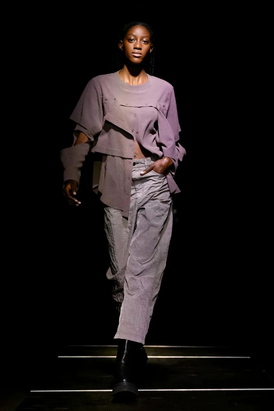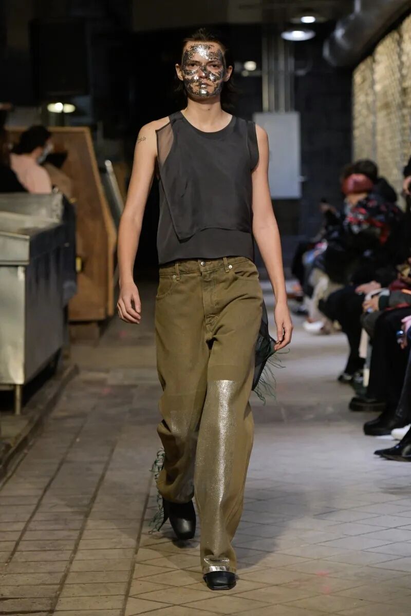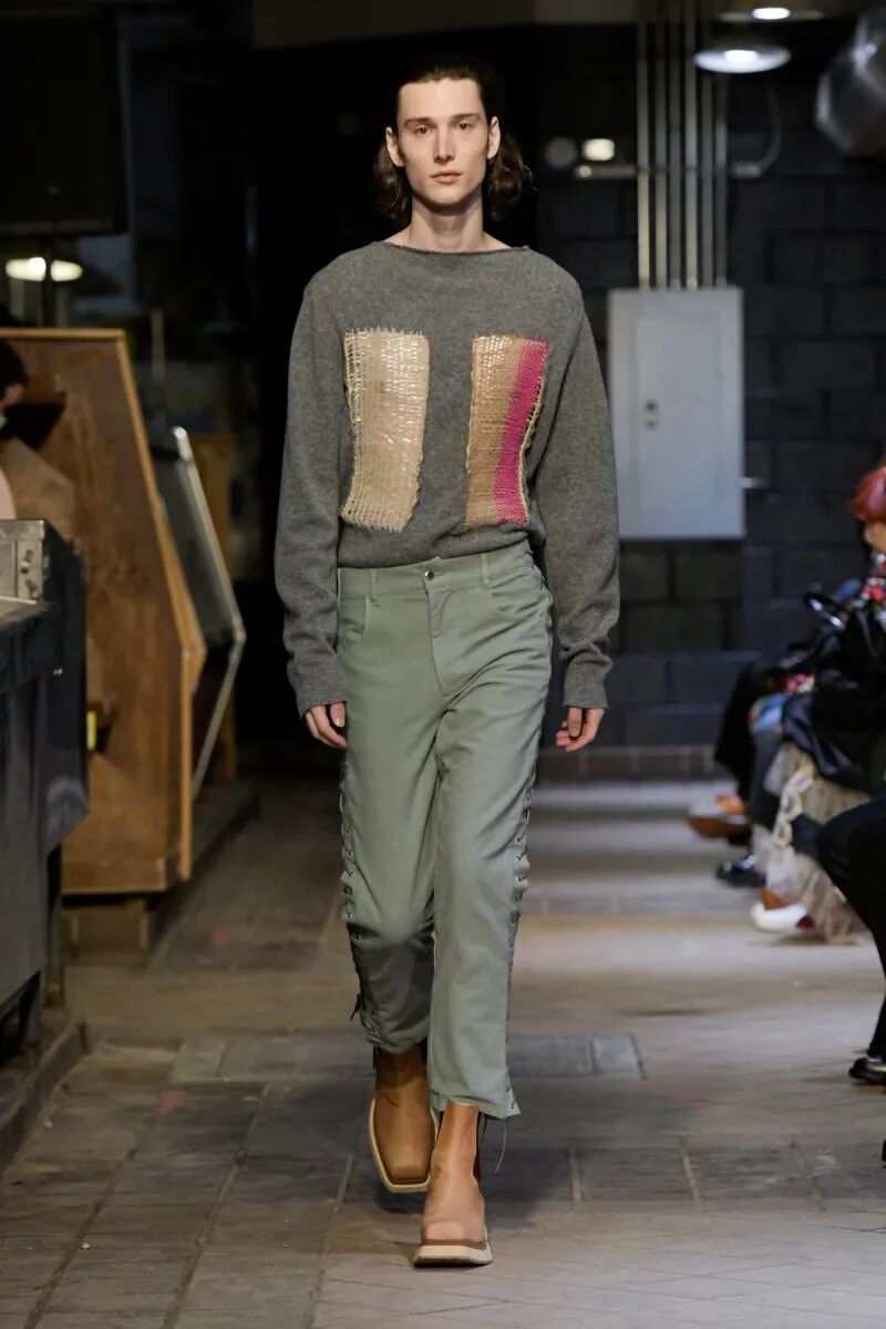 这对夫妻搭档十分擅长对过季剩余的时装布料的再利用,通过手工褪色处理,将颜色饱和度调低,减弱视觉上的冲击力但赋予材质扎实的质感,这也使其设计服装充满了反乌托邦、后末时代的气息。