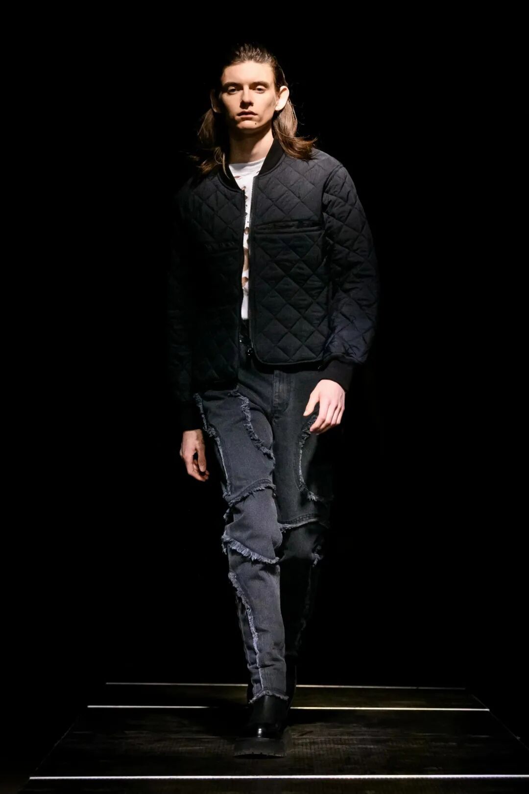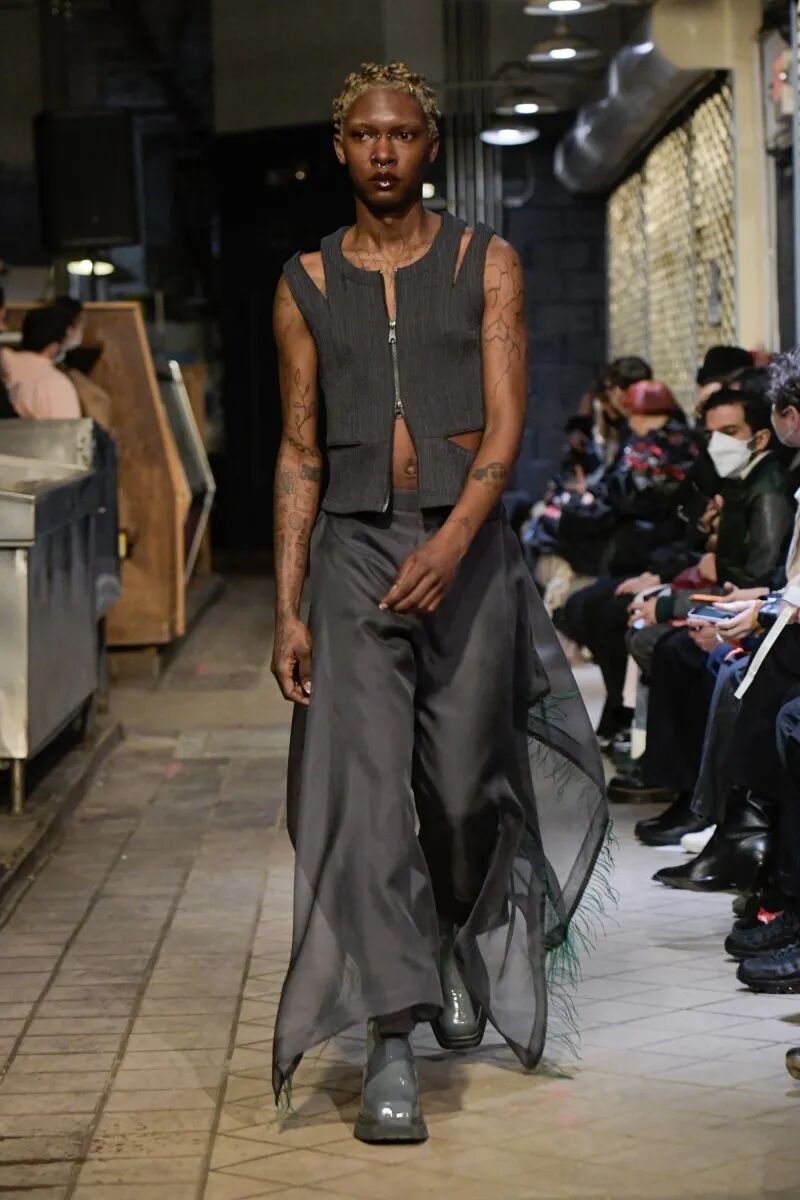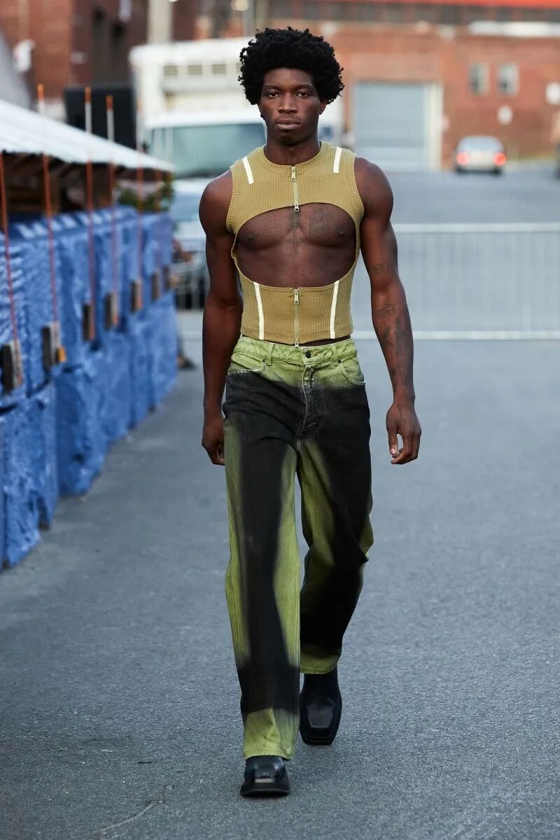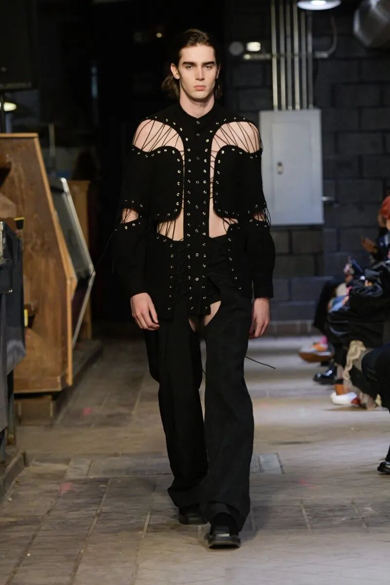 他们的几个经典单品以故意退化的形式被重新审视——特别是在经典的Eckhaus Latta牛仔裤,沿着雕塑般的接缝进行了变形。