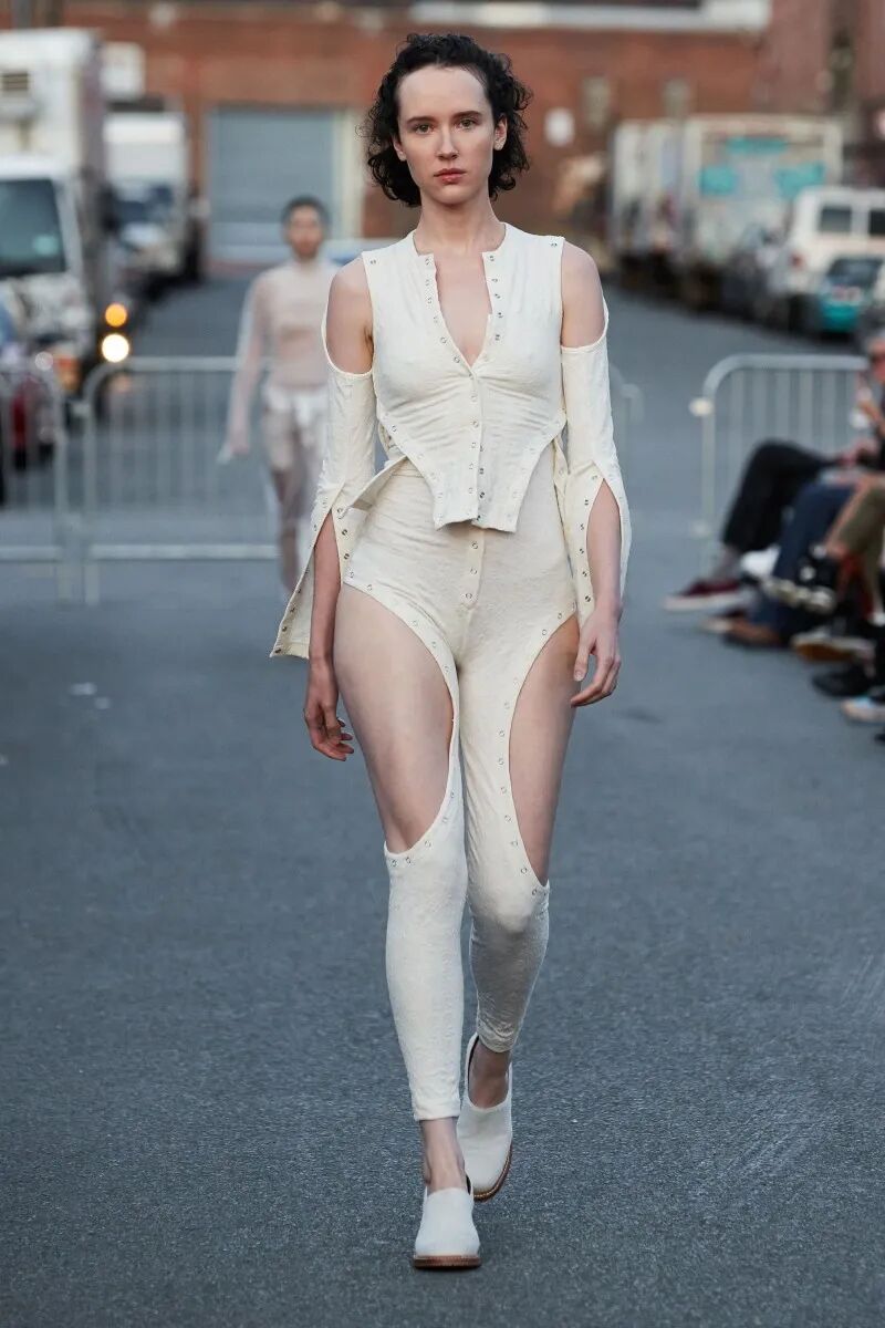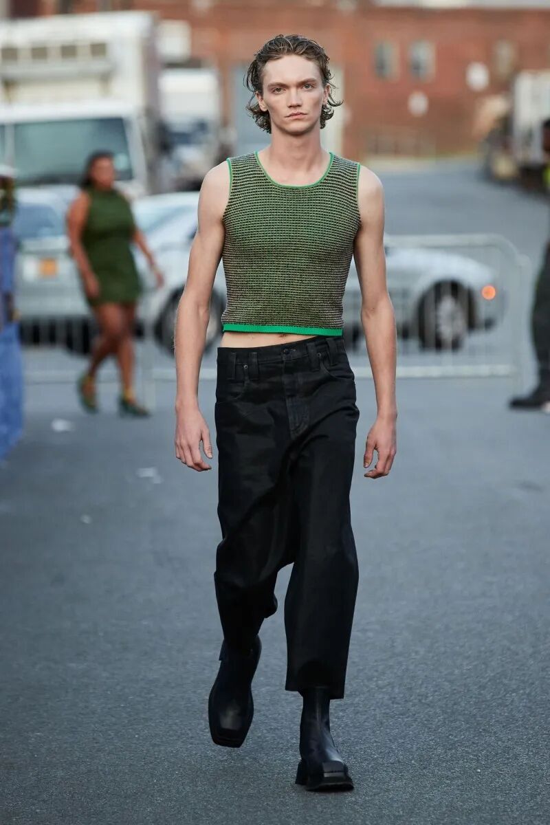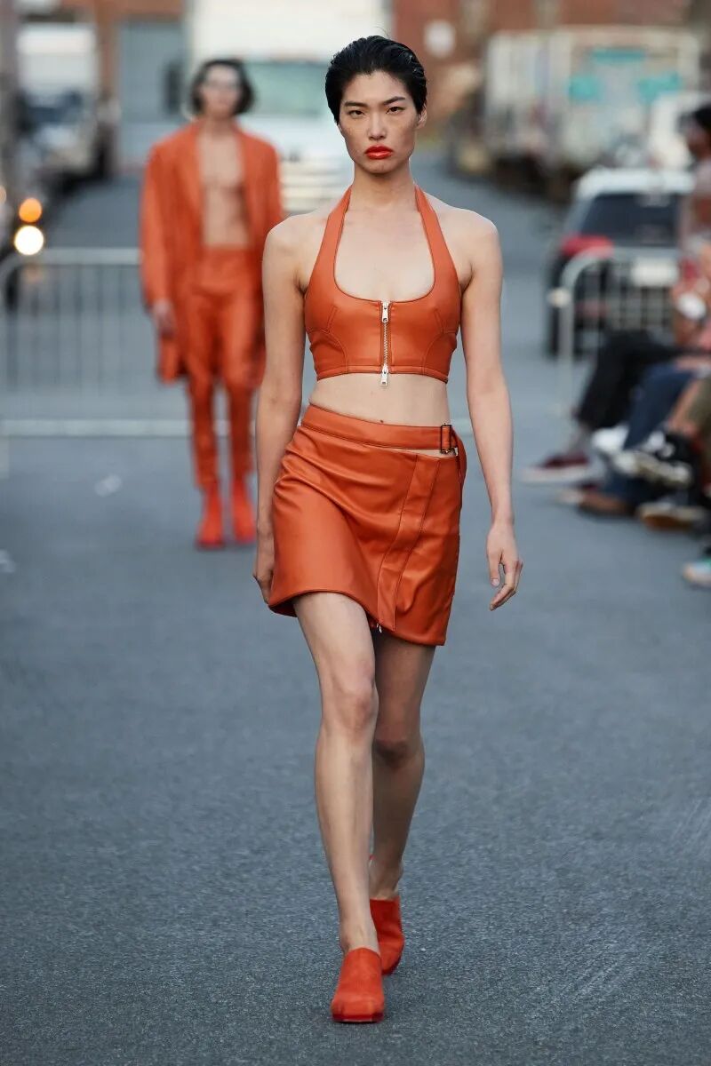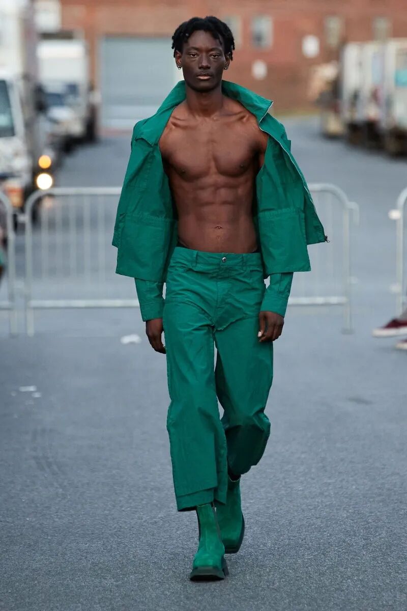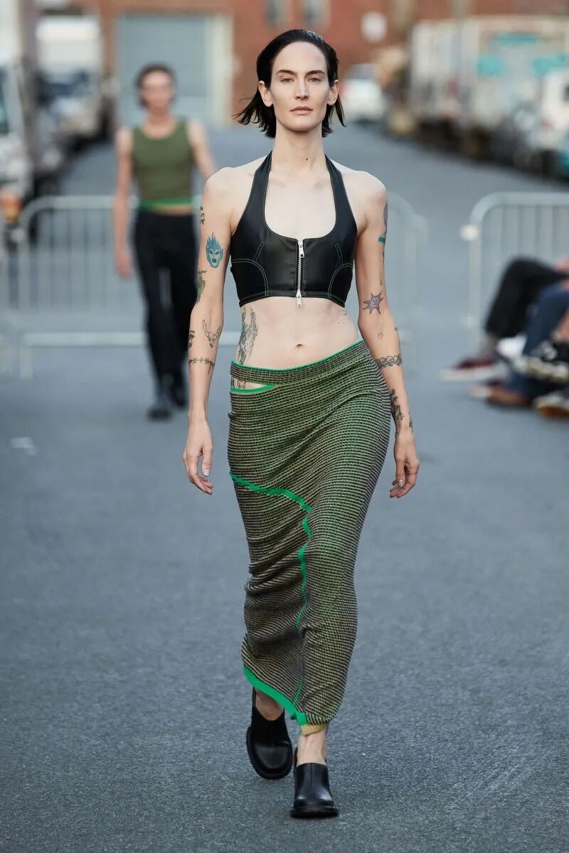 模特们的身体肌肤裸露着。在Eckhaus Latta的系列中总是能感受到Helmut Lang的前调和Susan Cianciolo的底调;这一次更多的是Helmut,而不是Susan。一系列光滑、朴实、性感的服装,以一种可被接近的方式对人体进行欲望的游行。