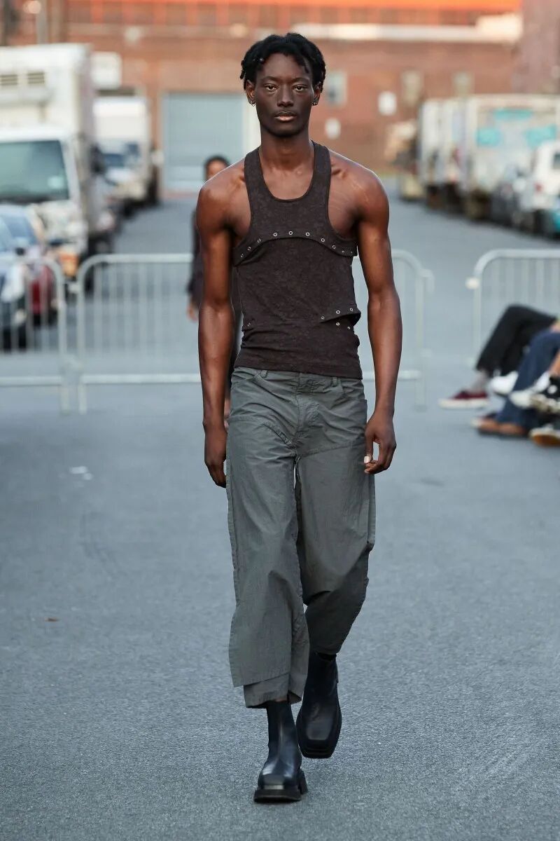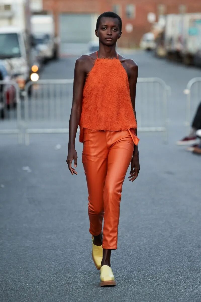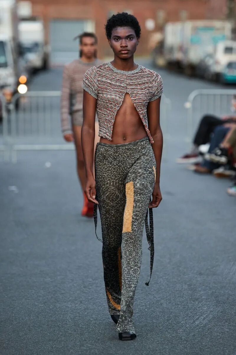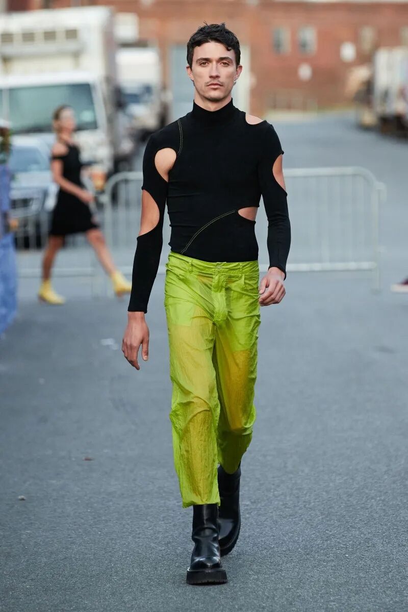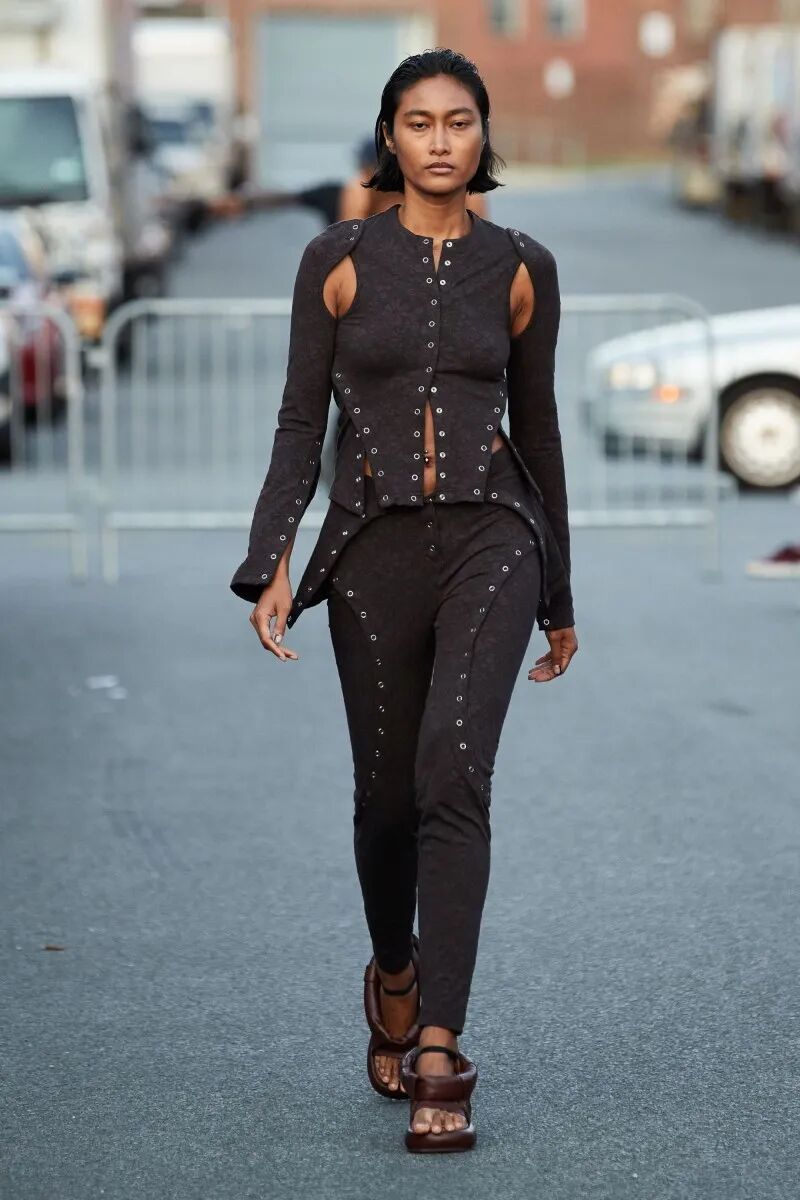 模特们的身体肌肤裸露着。在Eckhaus Latta的系列中总是能感受到Helmut Lang的前调和Susan Cianciolo的底调;这一次更多的是Helmut,而不是Susan。一系列光滑、朴实、性感的服装,以一种可被接近的方式对人体进行欲望的游行。