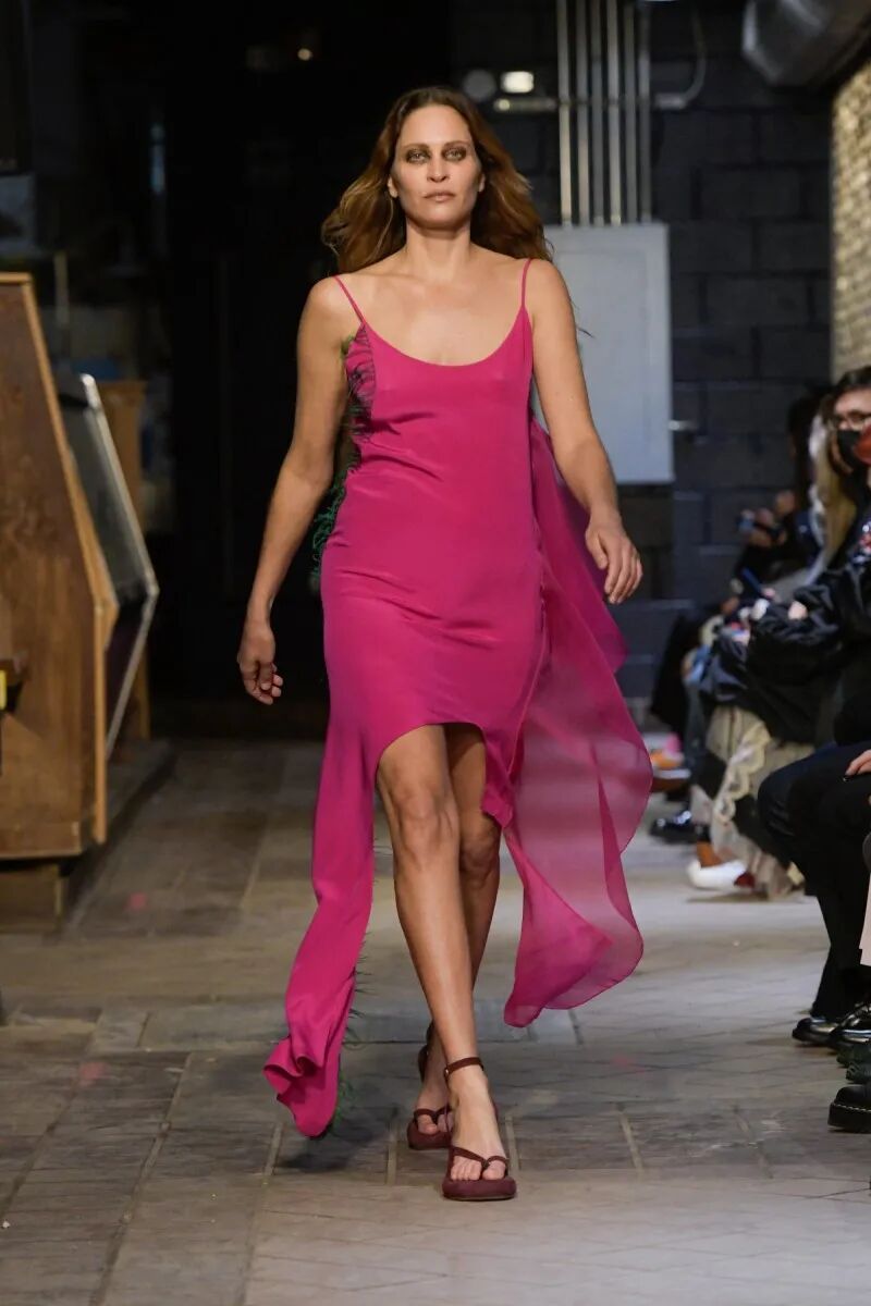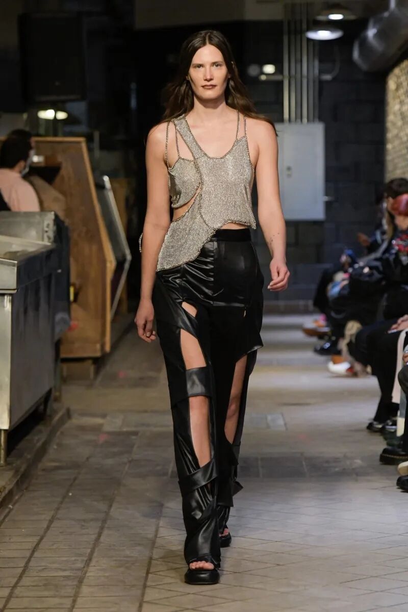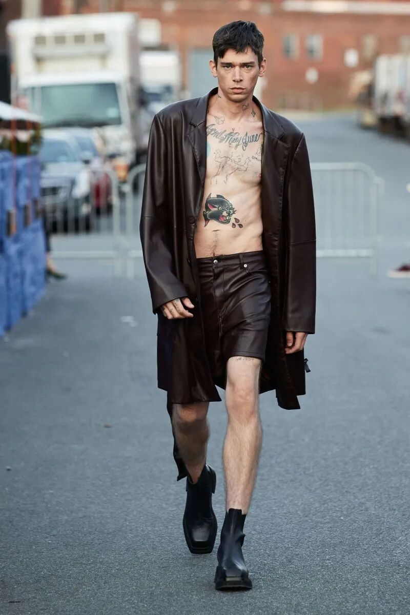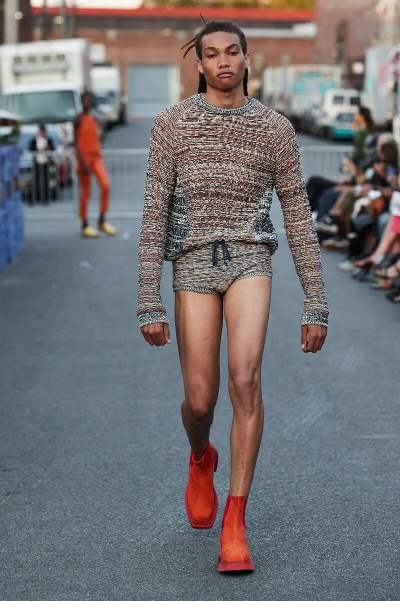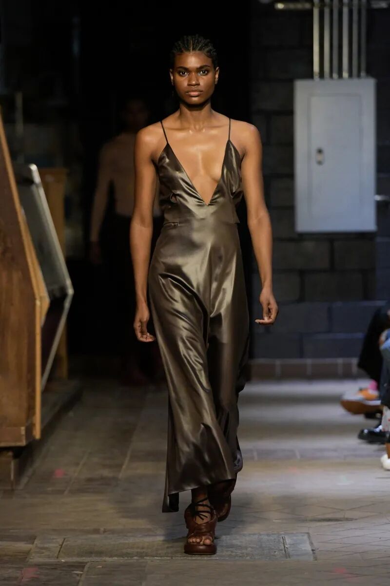 模特们的身体肌肤裸露着。在Eckhaus Latta的系列中总是能感受到Helmut Lang的前调和Susan Cianciolo的底调;这一次更多的是Helmut,而不是Susan。一系列光滑、朴实、性感的服装,以一种可被接近的方式对人体进行欲望的游行。