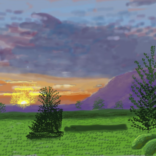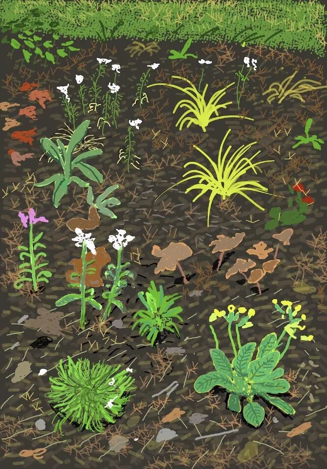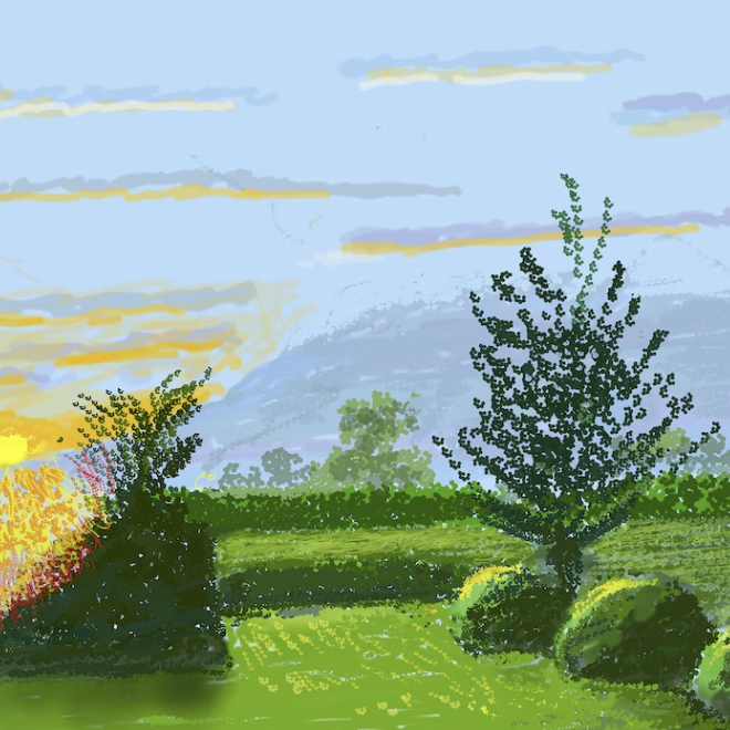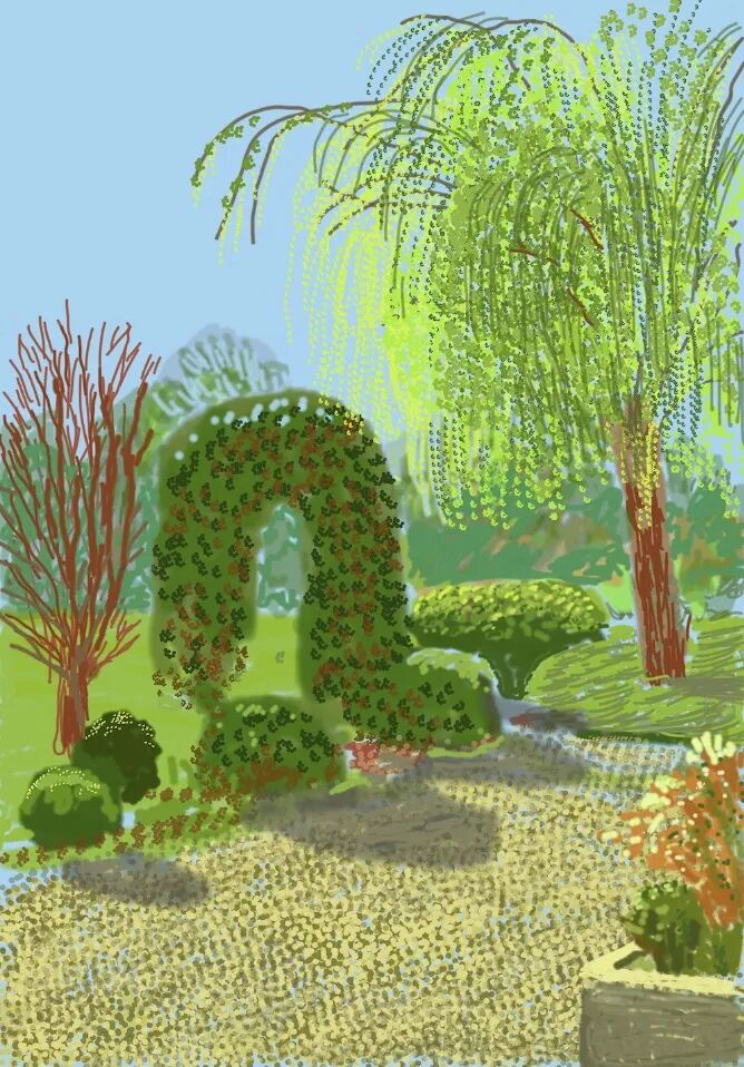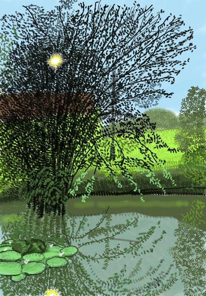 霍克尼在 iPad 上创作了这些画作,但这并不是他第一次使用 iPad 作画。在 iPhone 上工作之后,他于 2010 年首次使用该媒介,并享受 iPad 提供的更大的绘画表面。在接下来的一年里,也就是 2011 年,他使用该设备捕捉了东约克郡春天的出现,靠近他长大的地方,并迅速跟进了这个系列,拍摄了一个献给加利福尼亚优胜美地国家公园的美丽和威严的照片。从那以后,他将 iPad 用于许多作品,包括为纪念英国女王伊丽莎白二世作为在位时间最长的英国君主而设计的彩色玻璃窗设计,当然还有构成《春天的到来,诺曼底,2020 年》的 116 幅画作。