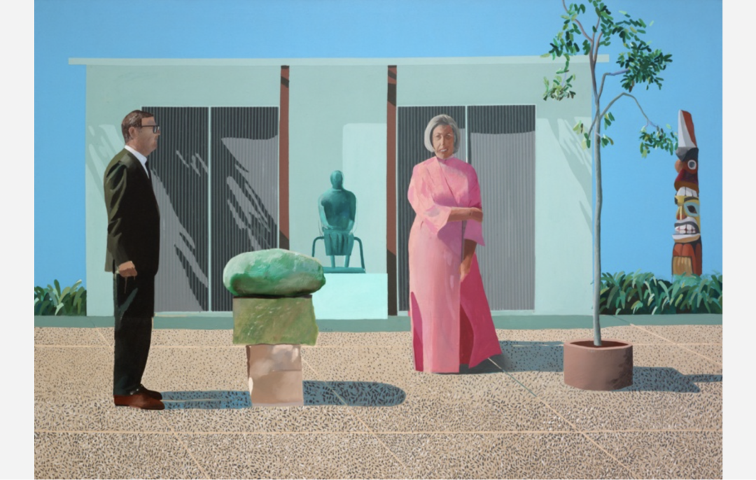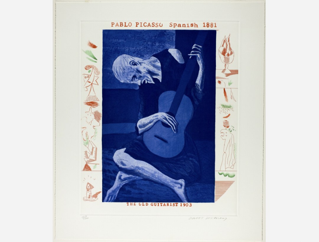 芝加哥艺术学院在三个收藏部门拥有这位艺术家的 78 件作品。其中最著名的是他 1968 年的画作《美国收藏家(弗雷德和玛西娅·韦斯曼)》,这对当代艺术收藏家夫妇在他们洛杉矶家中的雕塑花园中的鲜明肖像。博物馆的藏品还包括霍克尼 1976–77 年版画系列《蓝色吉他》中的全部 20 幅版画,该系列的灵感来自华莱士史蒂文斯的一首诗,探索了巴勃罗毕加索的各种风格和阶段。一幅版画《老吉他手》直接源自我们毕加索的同名画作。