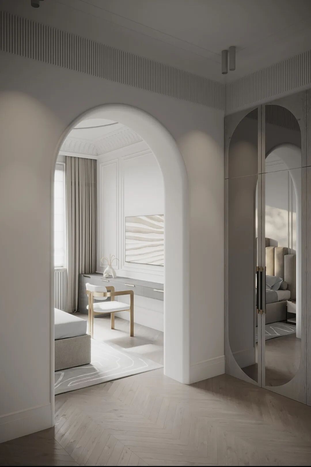 04. 最后将石膏板封在门洞的表面 并且在其表面涂抹与墙面 材料以及色彩一致的墙漆 也可以直接敷上一层饰面板 在细节方面尤其要注意 就是收口,可分为是否包边处理 两种形式的视觉效果各不相同 包边后的效果凸显拱形门的边缘和轮廓感 而未包边显得更加通透协调。