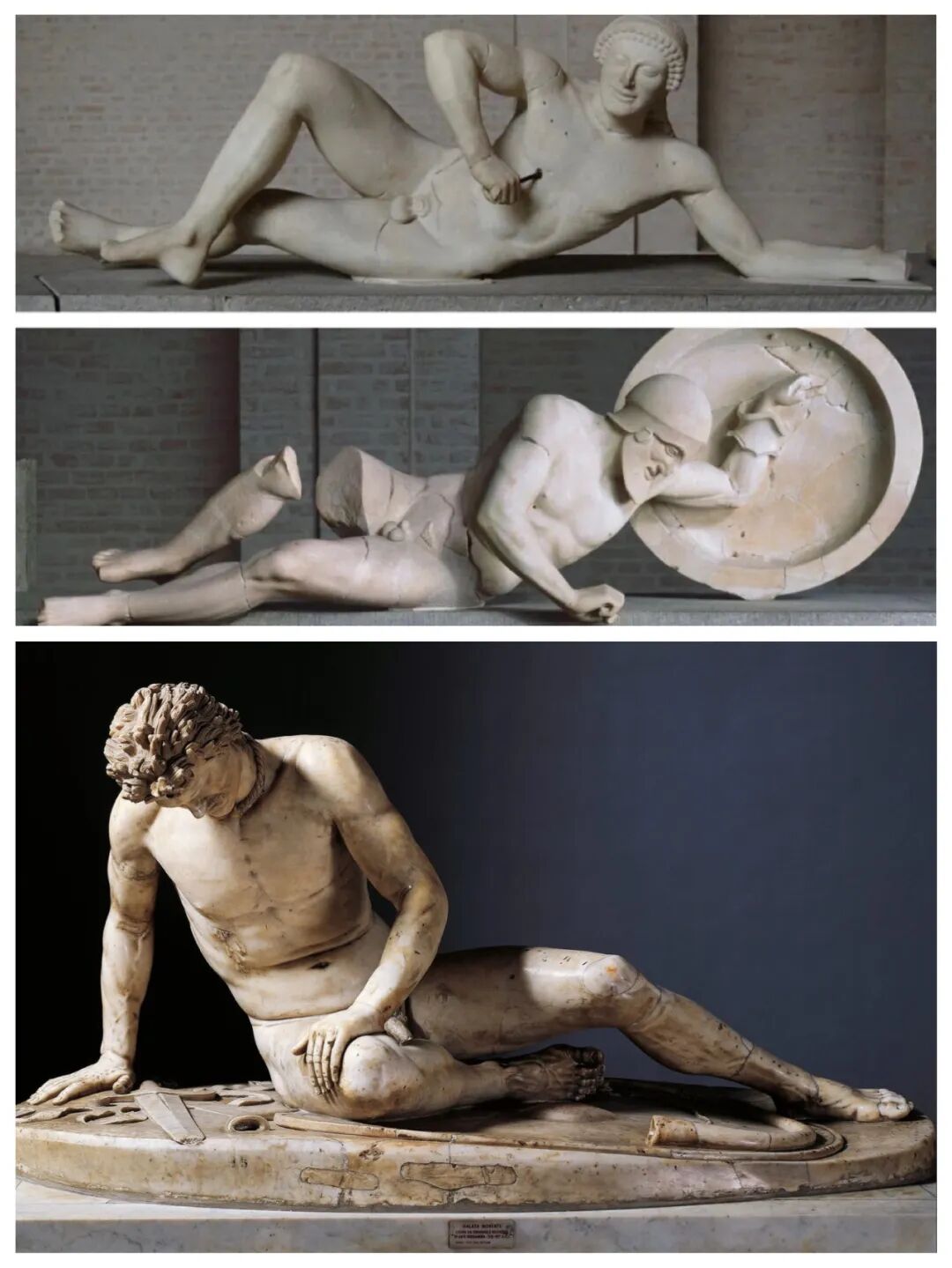 若论共情,《垂死的高卢人》(Dying Gaul)可能是希腊化时期最感人的雕塑之一。将它与阿菲娅神庙(Temple of Aphaia, Aegina, c. 500 BC)东西山墙上的两个濒死战士列在一起,便完成了从古风到古典到希腊化同一主题的清晰演变。