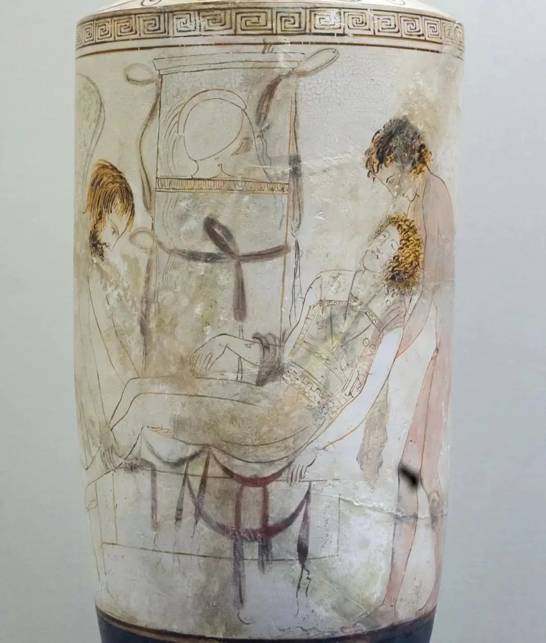 死神(Thanatos)与睡神(Hypnos)将一死亡战士抬起,古典盛期,细颈长油瓶 lekythos(局部),c. 435-425 BC。伦敦大英博物馆(British Museum, London)。