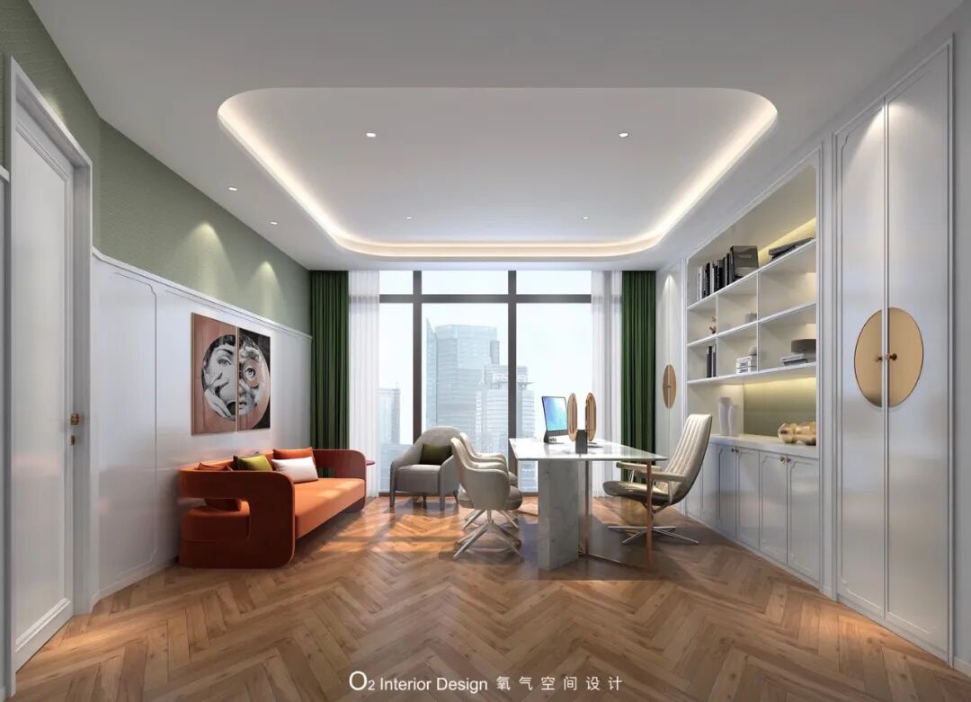 This office is female-led, with a comfortable and elegant sense of space, permeating the home atmosphere.Concise white and relaxed green collision, bring advanced visual enjoyment.  The portrait of a girl on the wall injects artistry into the space.  The integration of wood grain floor makes the unique office style more humane temperature.  Such a warm and pleasant field will bring more pleasant office experience.