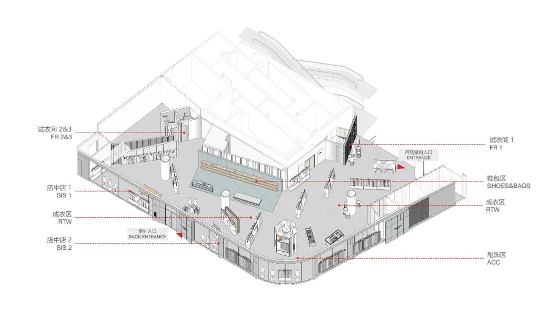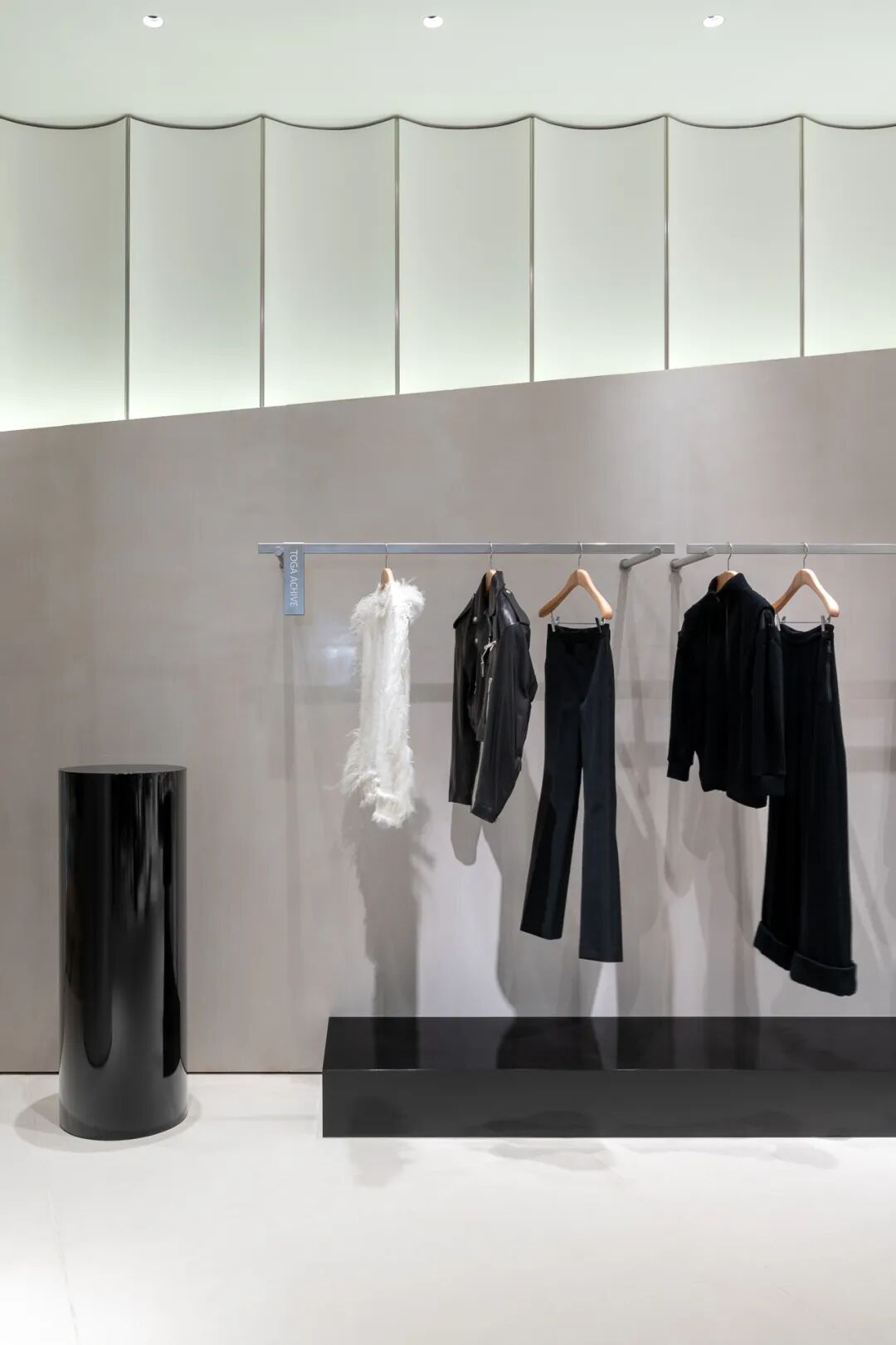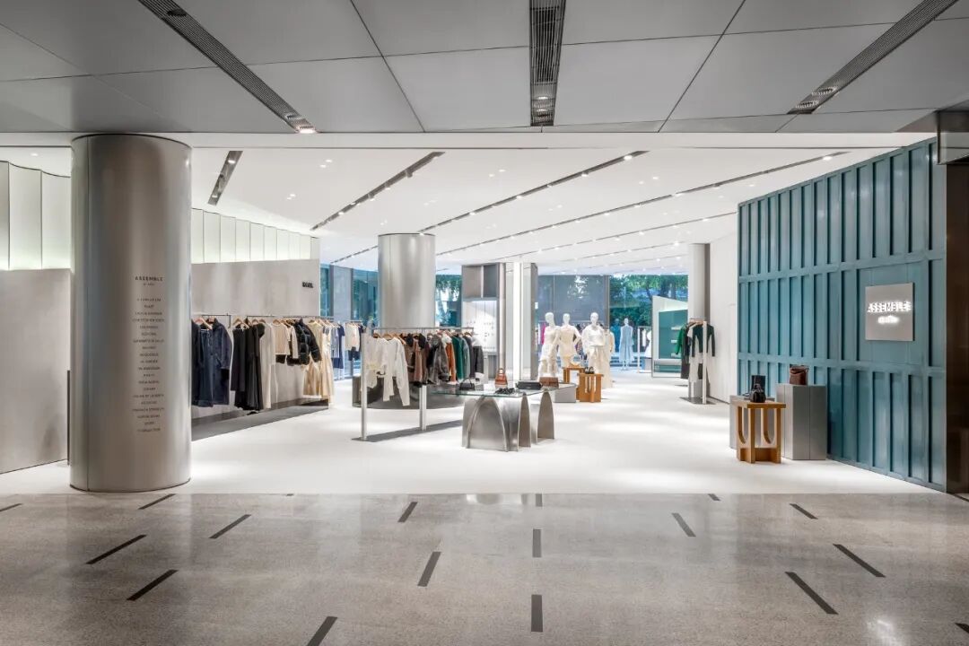 这些简约的元素结合在一起,为ASSEMBLE by Réel创造了优雅的展示空间,而“城市碎片”的概念也巧妙地呼应了Kokaistudios为同品牌三楼区域所做的以城市为灵感的设计。这些内敛的碎片暗示了建筑的整体性,而充满动感倾斜角度的墙面以若隐若现的方式,潜移默化地引导来访者穿过ASSEMBLE 在上海的最新场域。