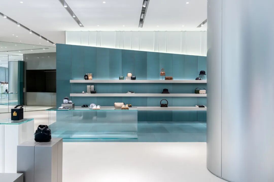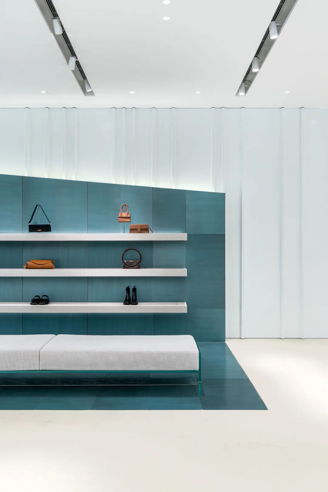 以大尺寸的熔岩石瓷砖通高到顶作为背景,清晰定义出鞋履箱包专区。通过阳极氧化铝包裹原有的立柱,为此区域增添了工业感,工字钢形状的长凳与展示台也有异曲同工之妙。而这些物件均由玻璃制成,材料表面晶莹脆弱的感觉与坚实耐久的结构形式并存,更呈现出透明漂浮的效果。