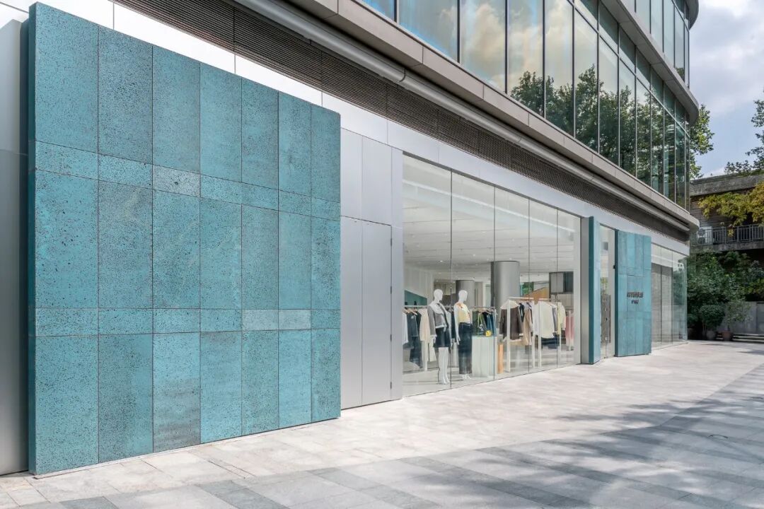 从室外看,Kokaistudios所设计的动态线条与非同寻常的材料相结合,创造了一个引人注目的建筑立面。釉面火山石板几乎贯穿商场的西立面,并被阳极氧化铝和通透的玻璃幕墙有韵律地截断形成统一且多变的店铺外立面。在白天,材料本身的肌理呈现格外清晰,而颜色也会根据时间与天气的变化在灰绿色和水蓝色之间转变。