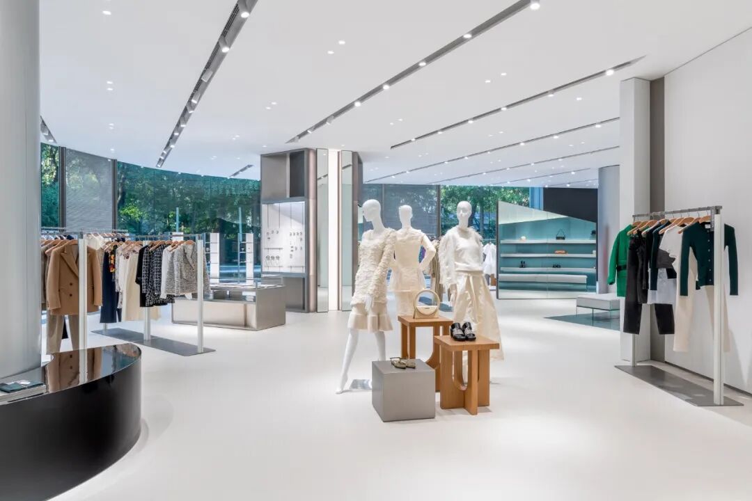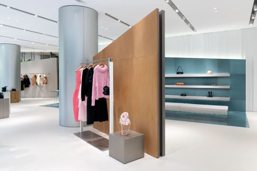 这个480平方米的空间有两个主要入口:一个入口是通往外部的,位于静安公园的正对面;另一个则是商场内部的开放式入口。当从内部进入,人们会看到一面梯形墙板,这样的墙板共有四面,贯穿于整个店面,一则是为了引导购物者穿梭于L形空间,另外它们还成为显示或隐匿材料、视线与空间关系的灵活装置。