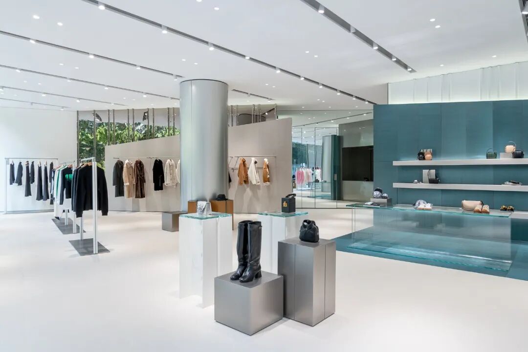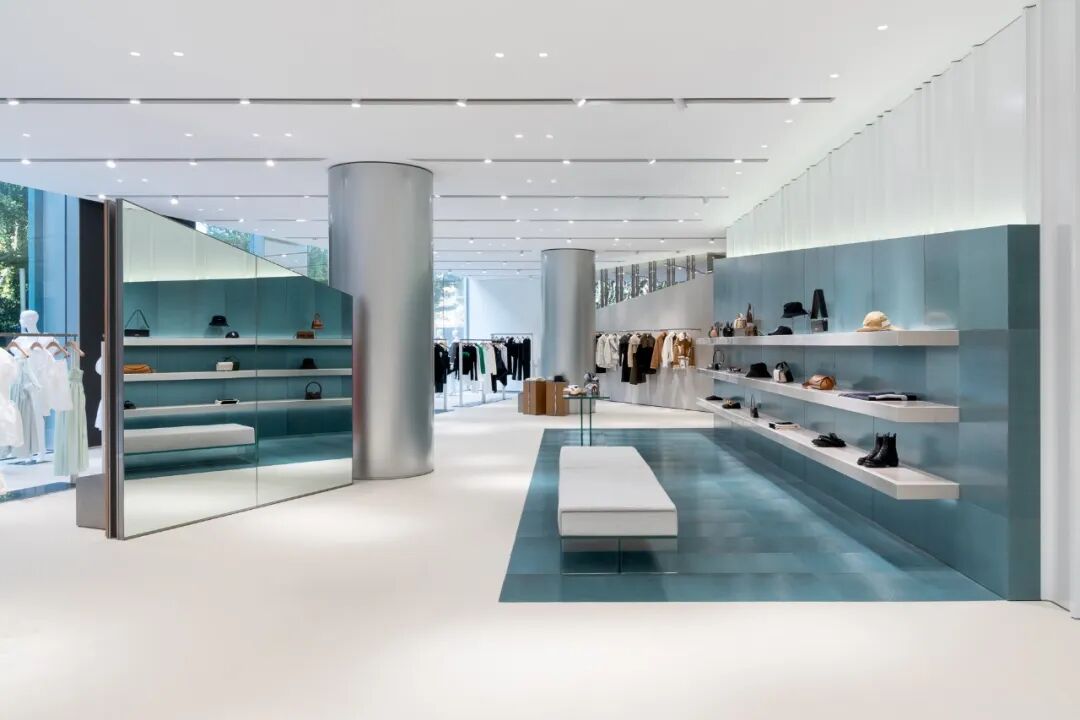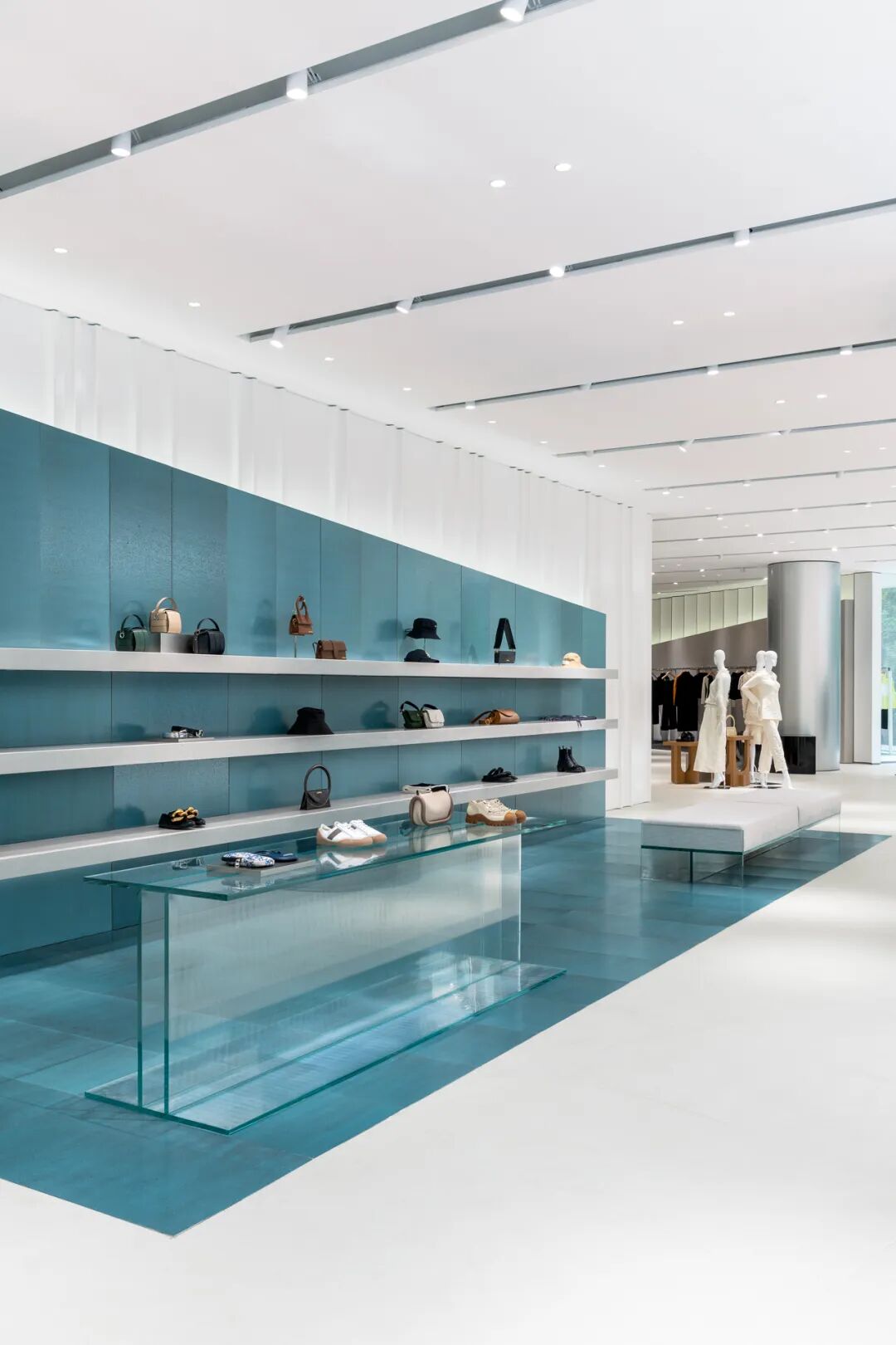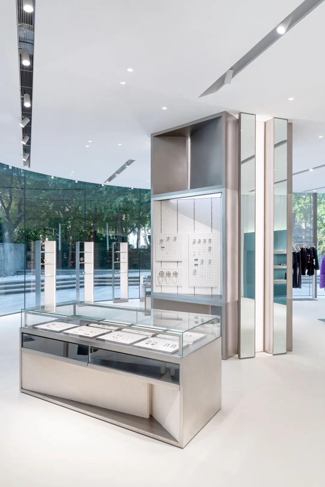 当购物者被引导至更具城市色彩的第二区,其视觉焦点会集中在从地面直通至天花板的“配饰立柜”上。这种垂直的展示结构让人联想起堆栈式窗口,它的三个主要体块都有珠宝展示,体块交接处的立面为墨镜陈列,其中穿插着各式倾斜角度的镜面。与之相邻的镜面墙立于拐角处,人们通过这里可以进入专门展陈鞋履箱包的空间,同时,这面镜子的高度与倾斜角度恰巧映照出室外远景的绿色植被,镜子背面的木饰面则与公园中银杏树相呼应。