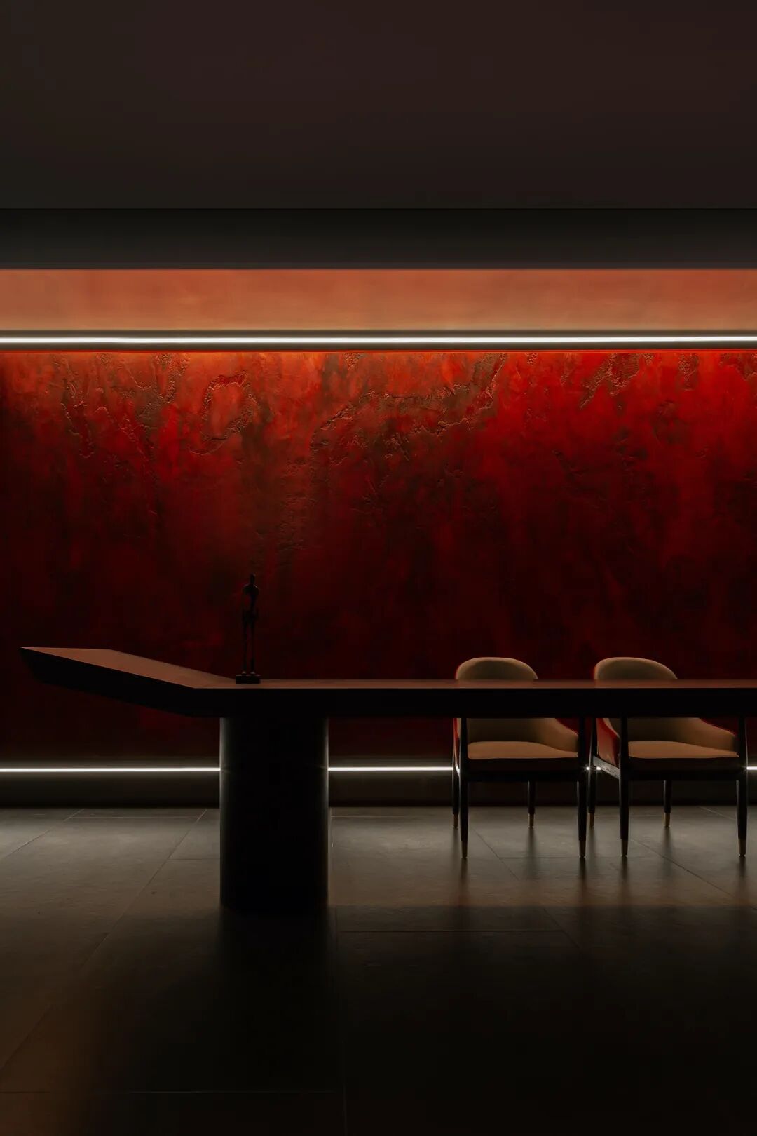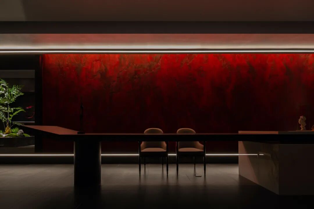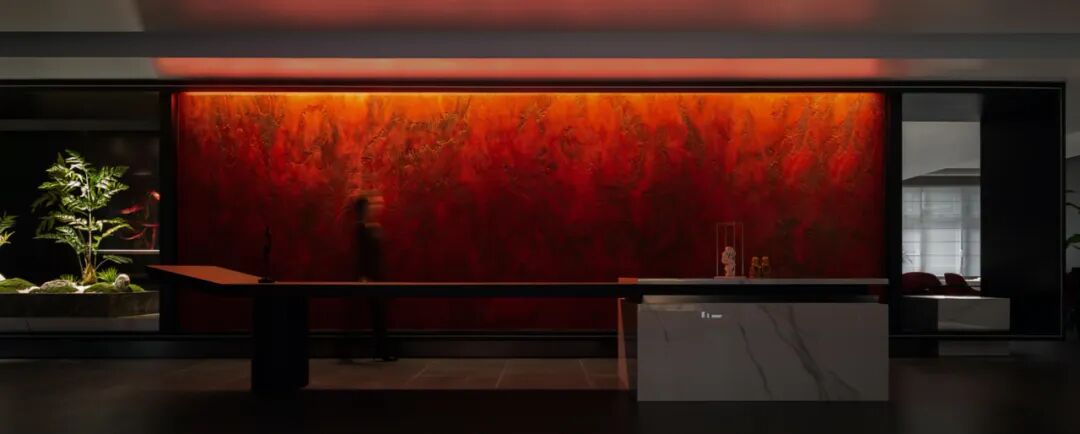 以艺术漆人工打造的“朱砂肌理”墙面,或明或暗,矗立其间,仿佛中华数千年的跌宕起伏,历史的脉动暗藏其中,故赋名曰“鸿蒙”。