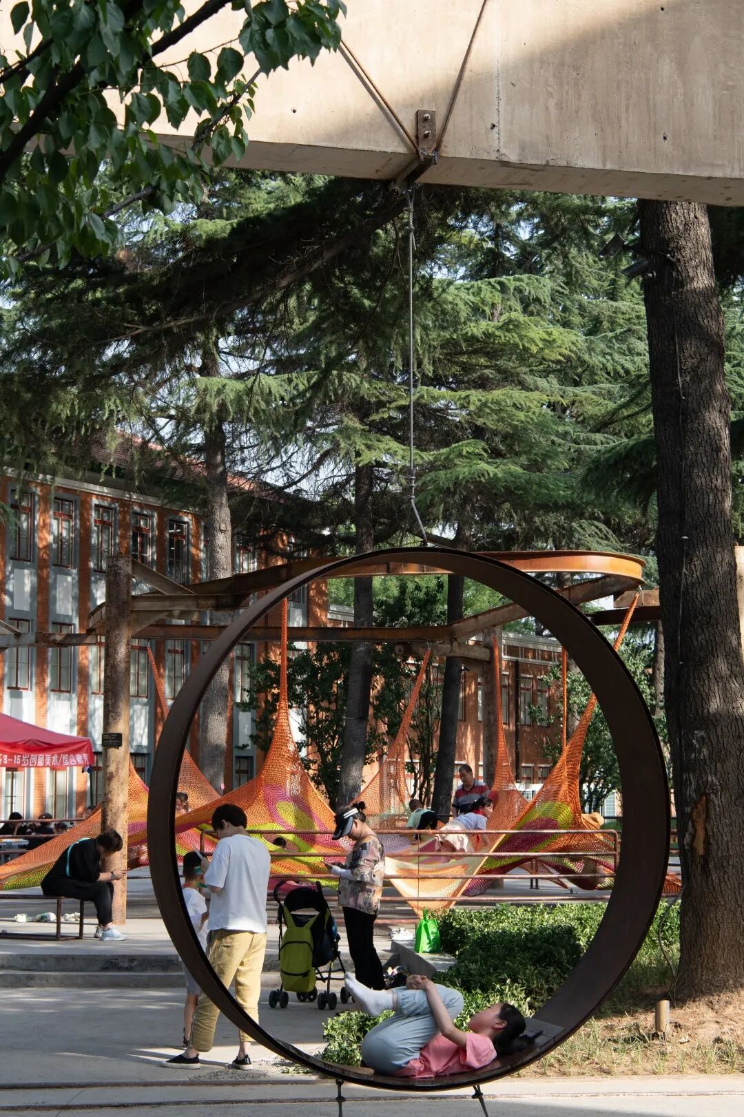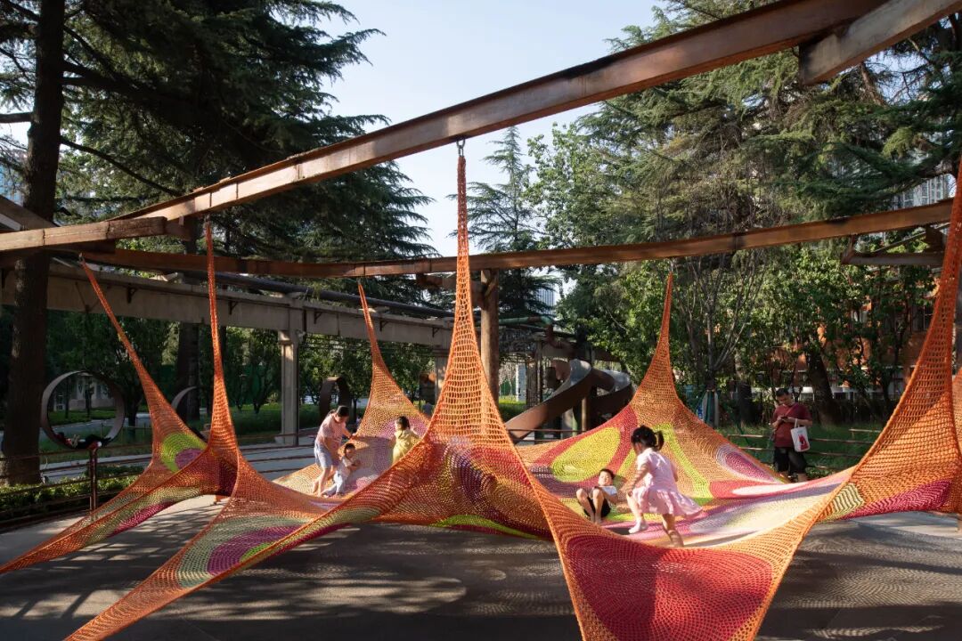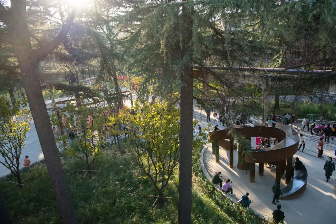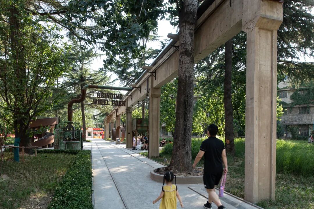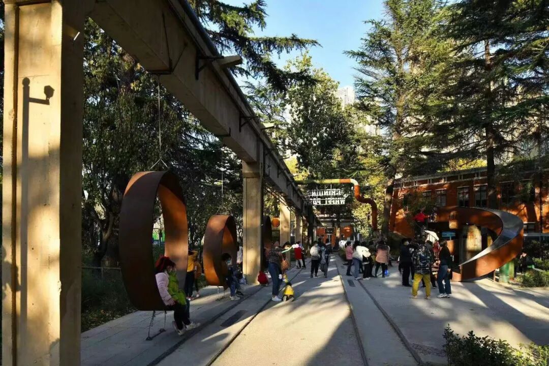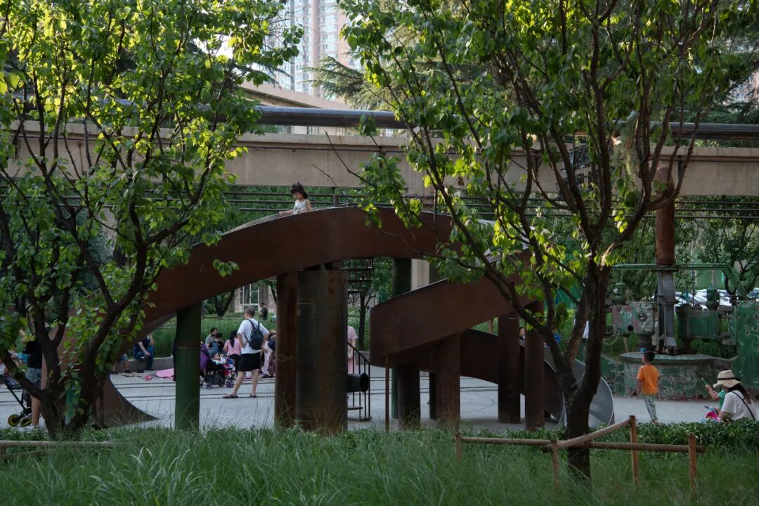 The grinding wheel park is a sports park that reuses the original production tools in the factory. Although these industrial relics have lost their production value, they have been given new functions and meanings after being reborn, and they have served the city in another form. With the theme of the "grinding wheel," the abandoned machines are transformed into interactive facilities for children such as climbing nets, slides, and seats.