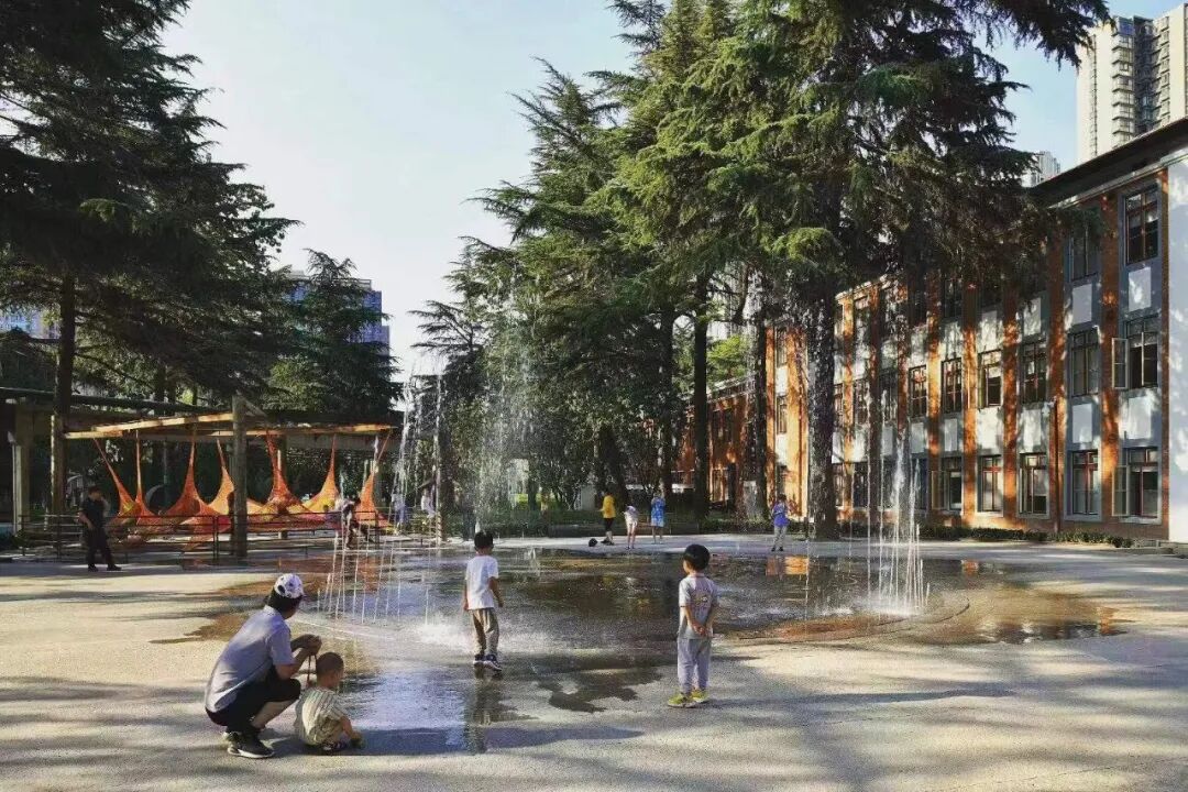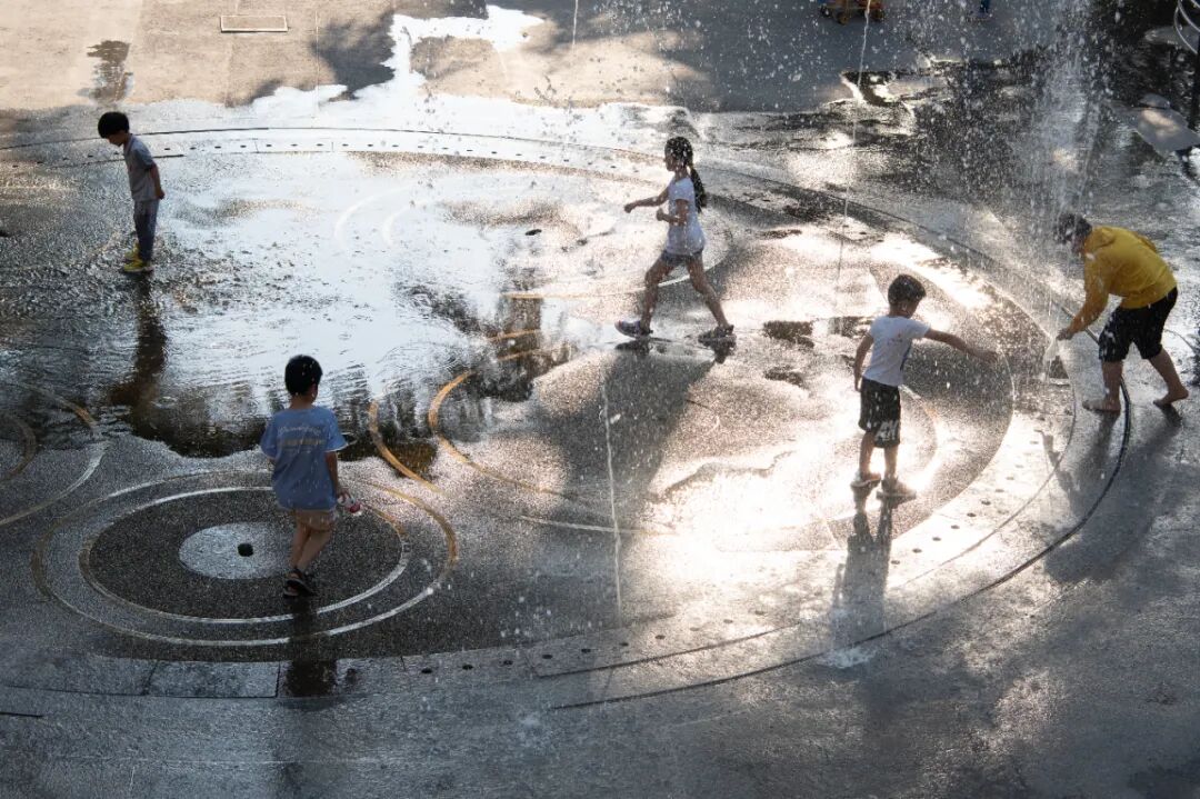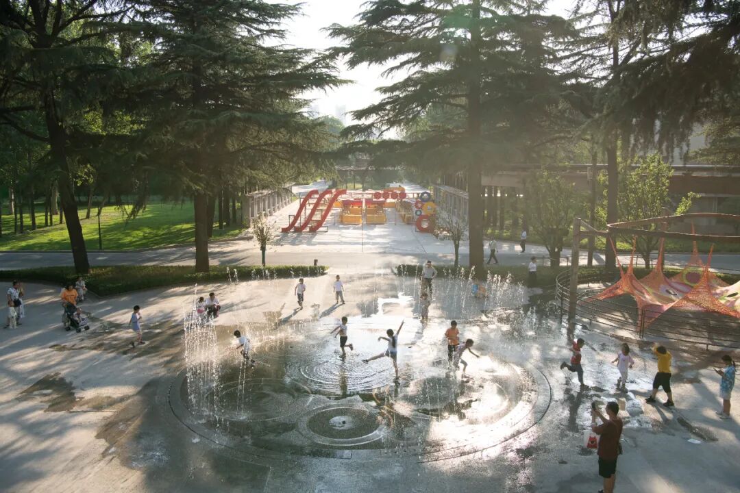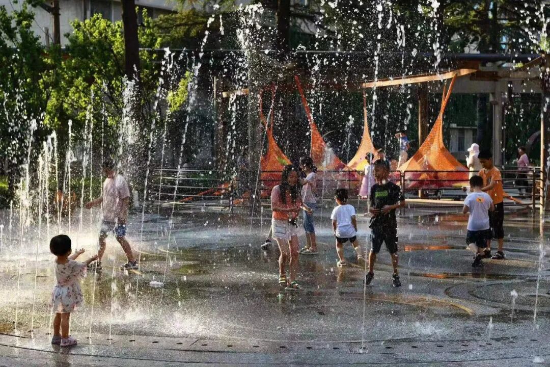 △ 老人带孩子在喷泉前玩耍