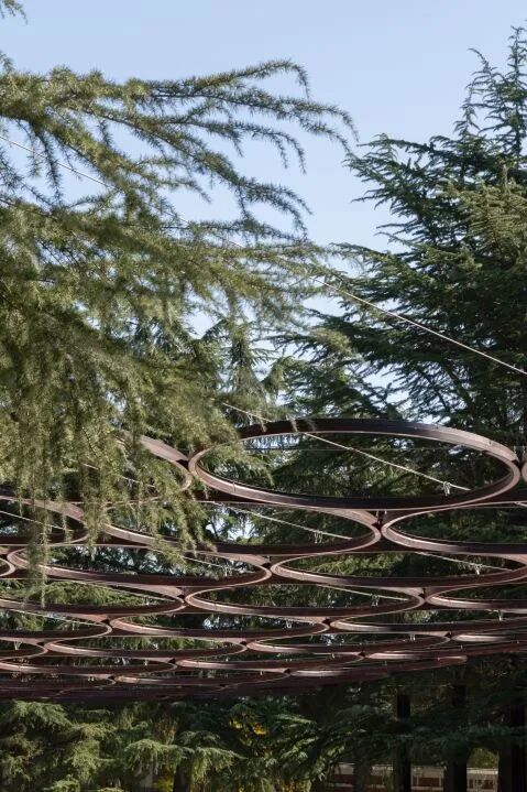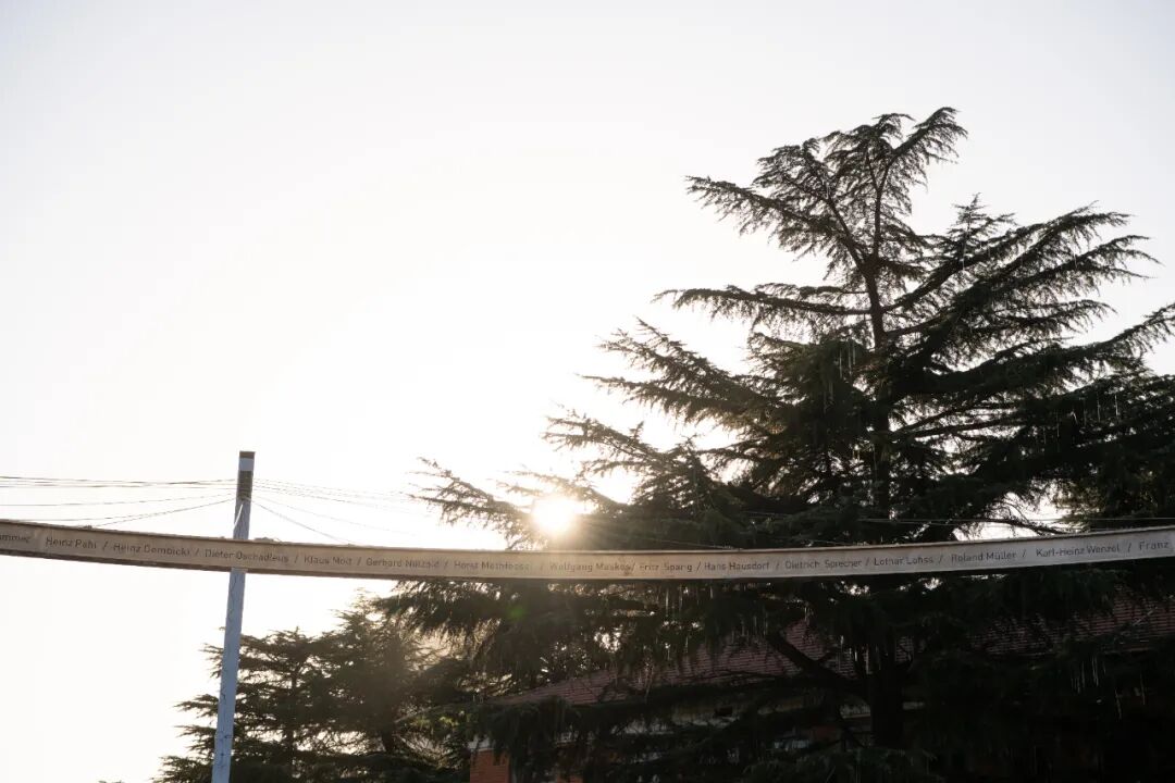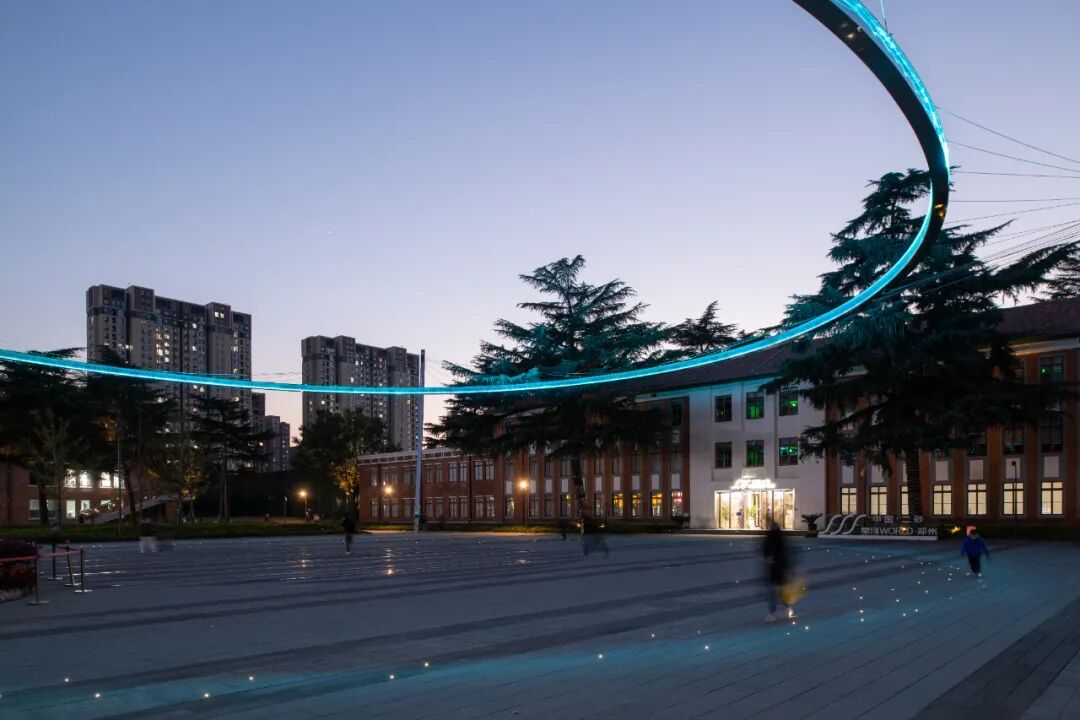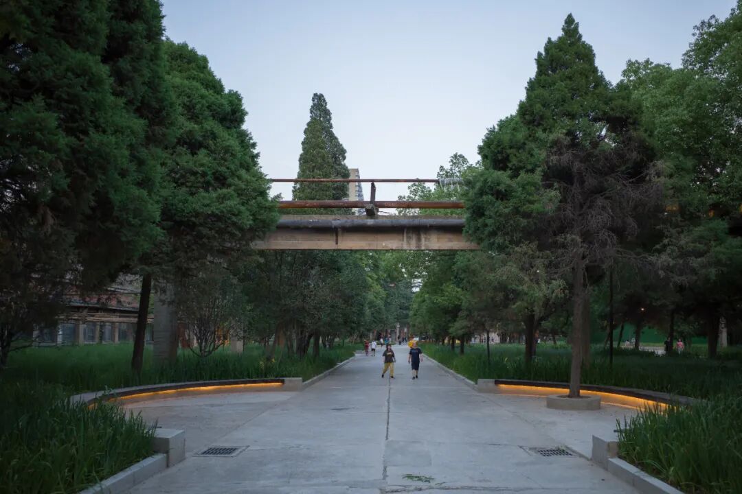 The sky above the front square carries the "Revolutionary Friendship" with a 40.2-meter memorial ring. The names of 170 East German engineers and model workers who have worked hard to construct the 2nd grinding wheel plant are engraved on it as a landmark to witness the revolutionary friendship. The Ring of Memory is restrained by four steel pillar suspension cables, echoing the 320-star lights on the ground that symbolize unsung heroes. The retained cedar, a series of concrete columns, and pipes on the right side of the site form a solid visual and moving line guidance.