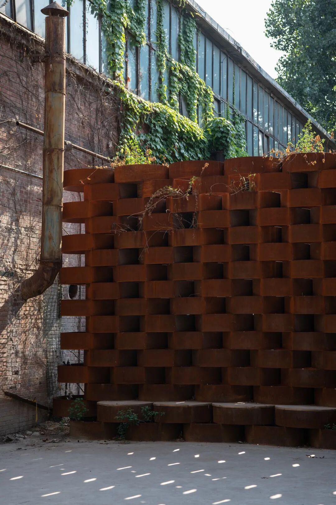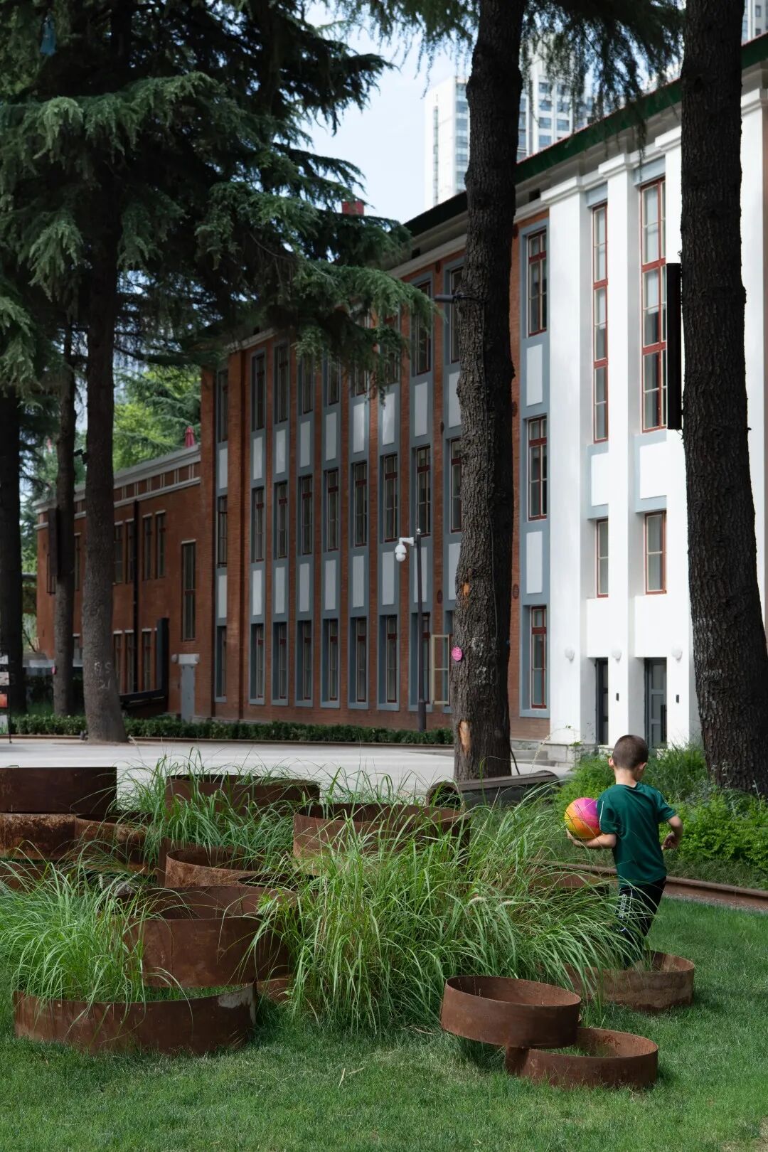The experience garden has designed a space that is highly integrated with the factory building with the method of "micro-renewal," which maximizes the preservation of the characteristics and memory of The 2nd grinding wheel plant: the original trees in the site, such as cedar and sycamore, are preserved; the original concrete blocks are smashed and integrated into the pavement; the former newsstand is turned into an urban rest space; the abandoned green space is reused and transformed into an amusement park; the abandoned blower is transformed into a landscape sculpture; the grinding wheel is built into a green wall of plants, reactivating the small space.