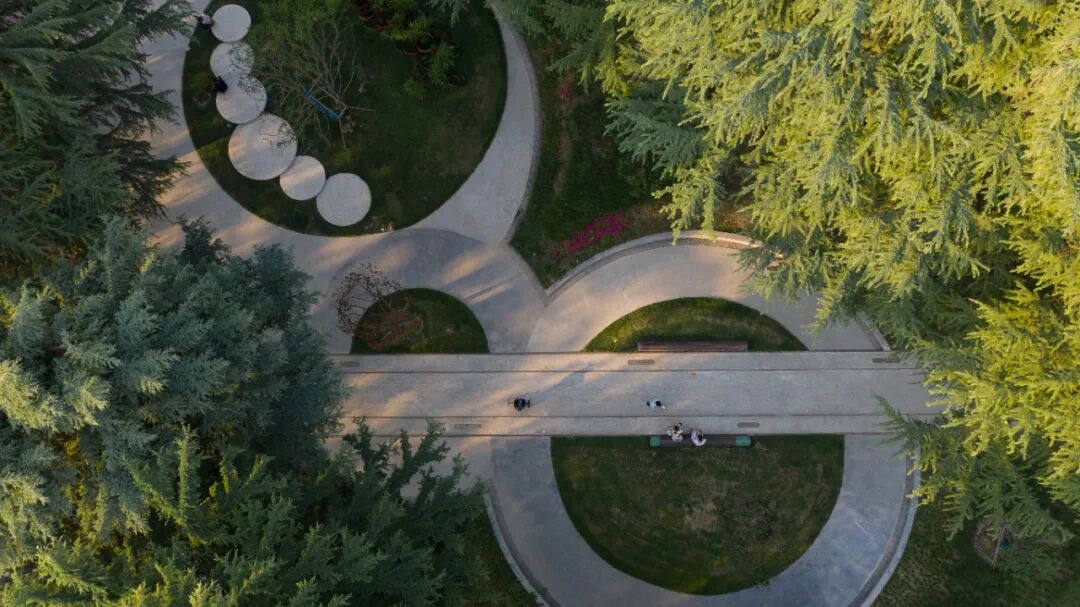 Starting from the original industrial, cultural genes, and historical memory of the 2nd grinding wheel plant, the site is divided into three parts: the diamond plaza, the grinding wheel park, and the ersha green corridor, which are connected in series through the sweet gum woods, central avenue, and Wutong avenue. The texture of the site is sorted out with the concept of "round sky and square earth." The straight axis of the Main Square and circular grinding wheels are interspersed at important space nodes, forming different scales and functions and stimulating public activities at different levels.