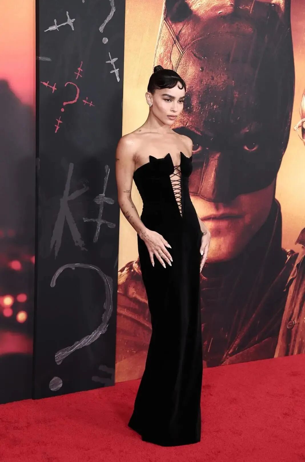 在《新蝙蝠侠》伦敦站的首映礼上,她那袭经典裹身版型的Saint Laurent黑色礼裙,胸前的镂空设计倒是与猫女面具的形状相似,整体造型端庄典雅。