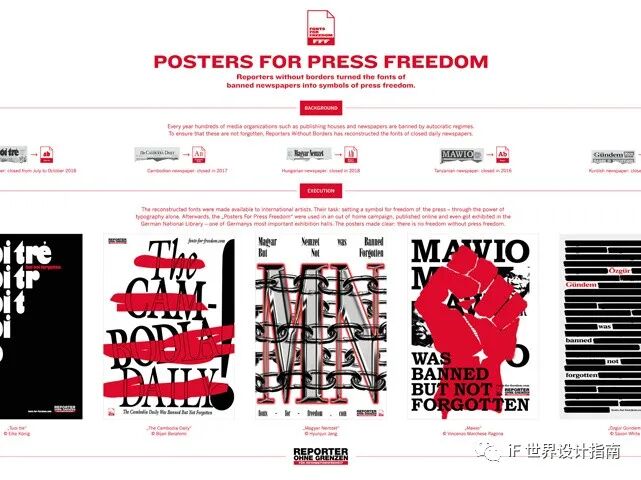 每年,上百家出版社和报社等媒体机构会被独裁政府取缔。为揭露这种国际压迫,无国界记者将这些受到禁言的日报字体重新改造,让他们化作新闻自由的象征。