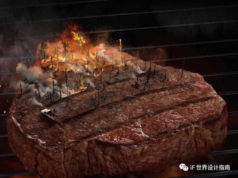 全球牛肉消耗野蛮增长,已成为世界原始森林破坏的主要原因,这张印刷宣传海报便为解决此问题而设计。牛排的纹理好像焚烧过的森林焦土,又似砍伐后的林地,这幅艺术作品用巧妙的设计呈现出二者的相似性。喷香的牛排照片先行抓住看客眼球,再吸引他们关注详实描绘的毁林细节。