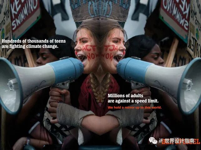 创意与尖端科技同等重要。信息的呈现方式足够清晰简洁,消费者才能够迅速理解。但精巧入时的美好设计与之并不冲突。比如可持续宣传运动 “SHINSEGAE” 就将趣味十足的方法运用到 “保卫地球” 这个严肃问题上。手绘风格的图片朝气蓬勃,搭配手写字体,其传递的信息更能引起成年消费者的情感共鸣。iF 金质奖作品 “Super Policy” 也是一个范例,它便将枯燥的政府信息化为色彩缤纷的宣传海报。再让我们反过来看看图像宣传 “We hold a mirror up to this world”,这张杰出的传播作品摆明立场,反对世界中的失德行为。