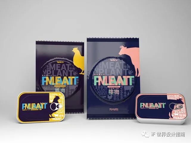 这是为人造肉制品设计的系列包装。“PLANT” 和 “MEAT” 两词交叠在一起,作为本款包装的主要平面形象,表明这是一款植基的肉类替代品。动物的半身剪影一方面让人联想起肉类制品,而另一方面暗示本产品并非真正的动物肉。