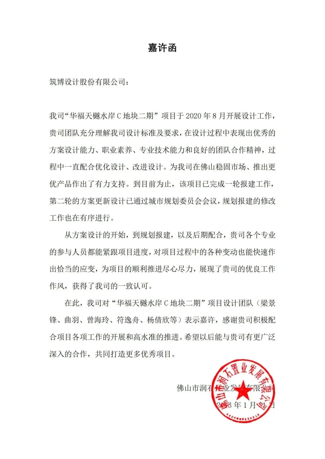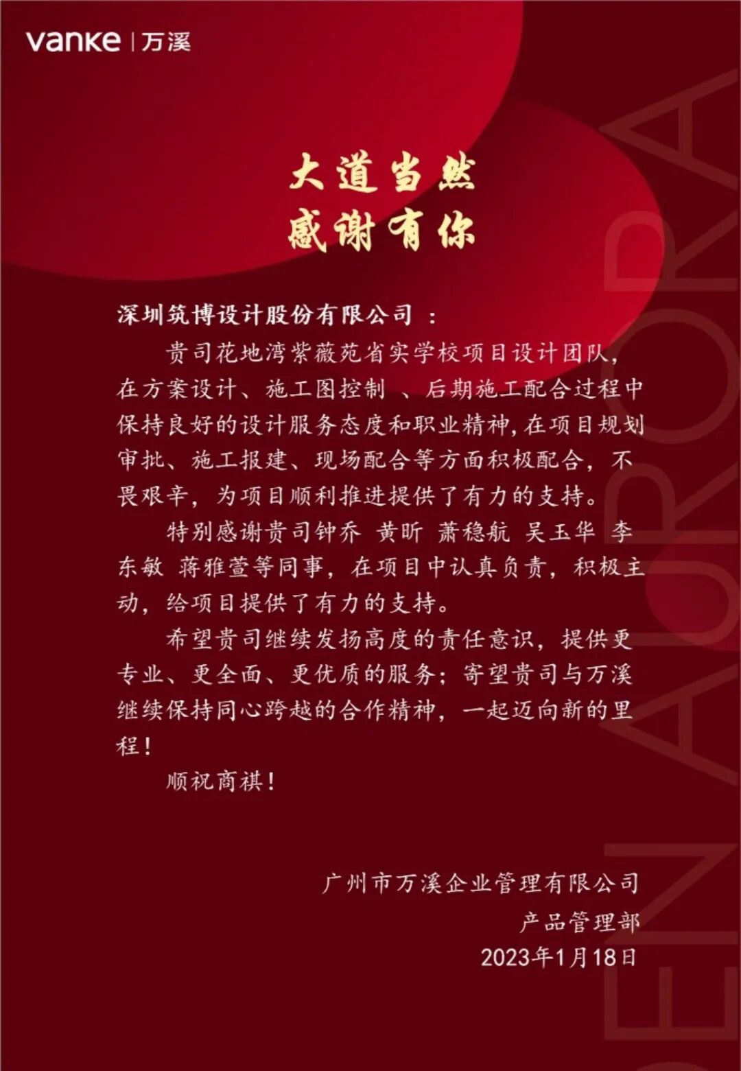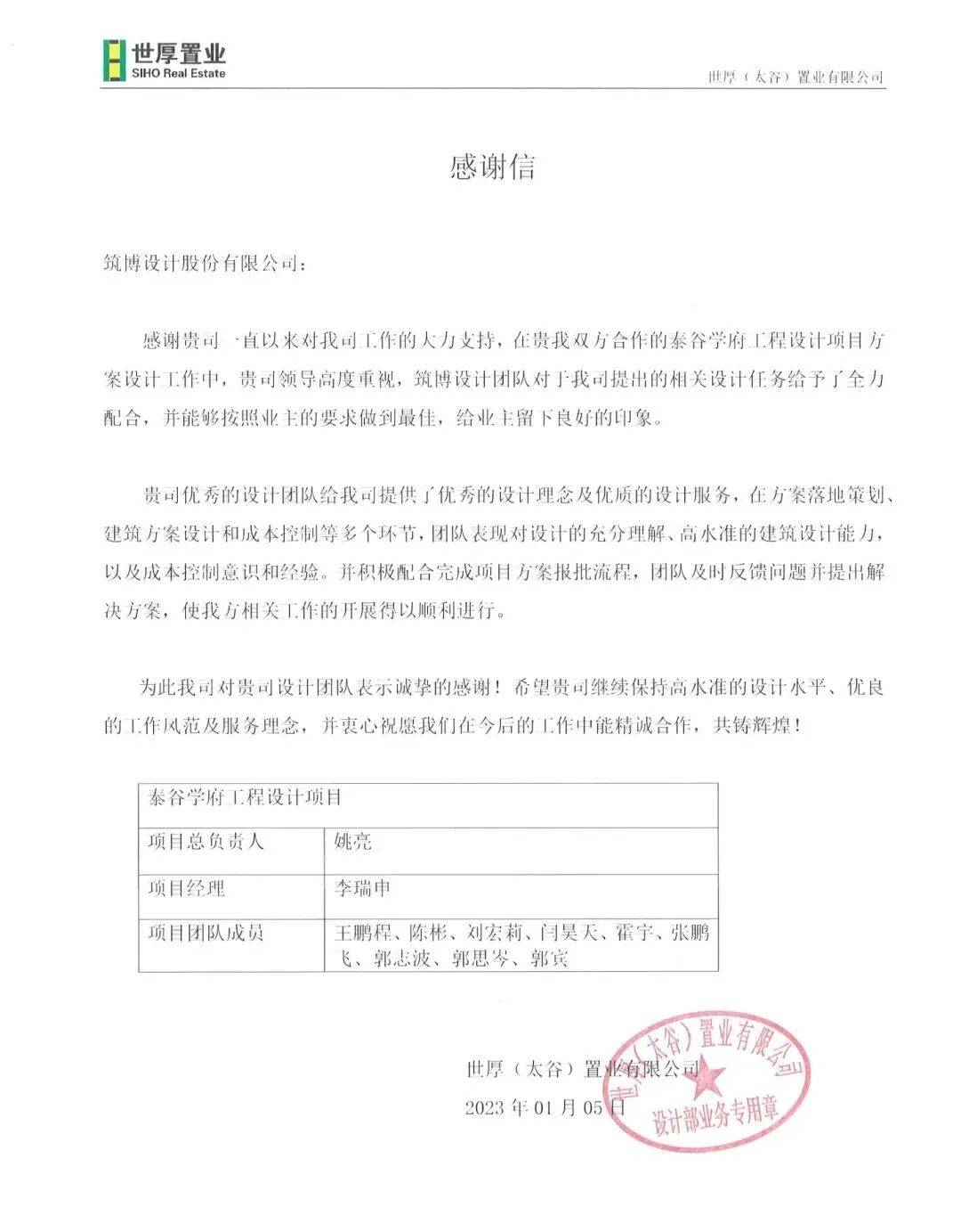 2022年,筑博设计各业务单元收到多封来自业主单位的感谢信与表扬信,信中表达了对筑博设计项目成果的肯定与各位同事辛勤付出的赞许,为2022年的工作画上了完美句号。期待新的一年与各业主单位加强合作,继续共赢!