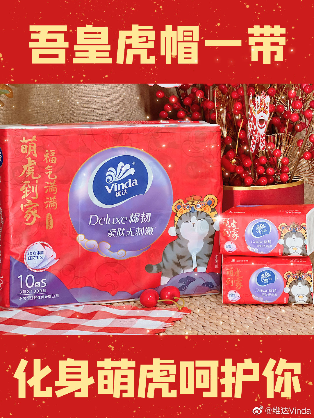 还有维达X吾皇万睡联名款。因为维达一直与吾皇万睡有联名合作,而在新年系列中,直接给吾皇带上了一顶虎头帽,便化身萌虎。