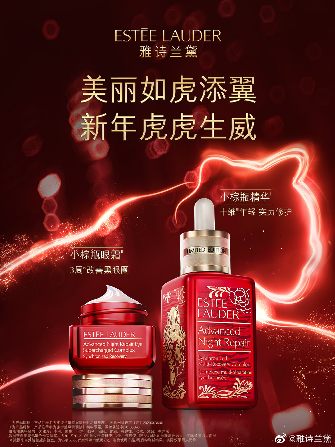 雅诗兰黛的“虎年生肖”新春限定系列,以虎啸图案叠刻蔷薇花纹,配以醒目开挂红,虎嗅蔷薇之态启幕新的一年。