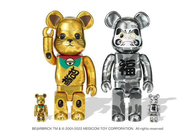 或许是因为老虎也算一只“大喵”,所以很多品牌也选择以猫代替虎的形象。A BATHING APE今年与MEDICOM TOY合作推出了两款新年特别联名BE@RBRICK,主题是“招财猫”和“达摩”,分别采用金银配色,身上还写有“招福”和“福”字。