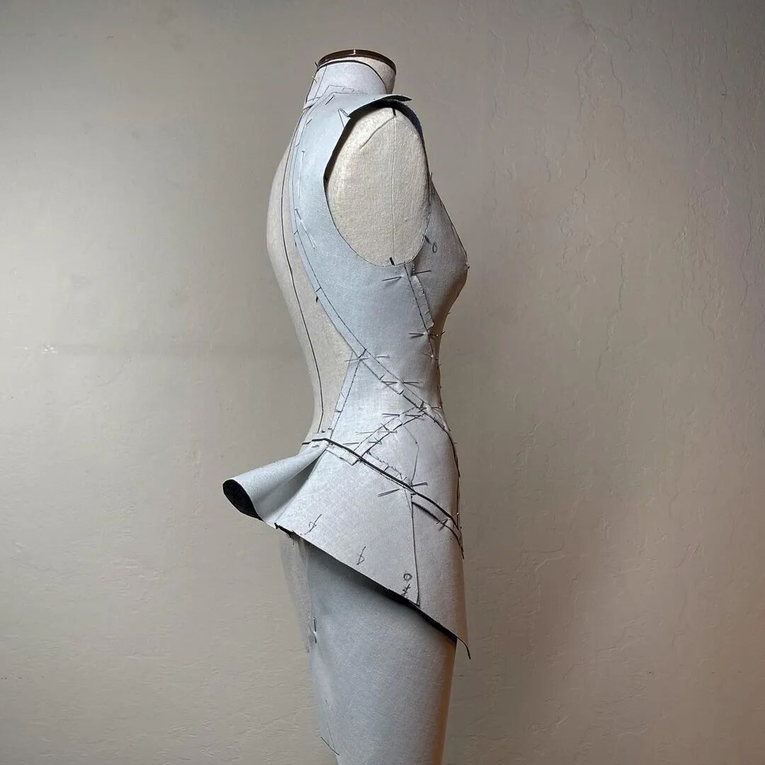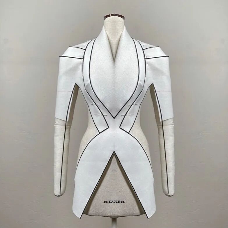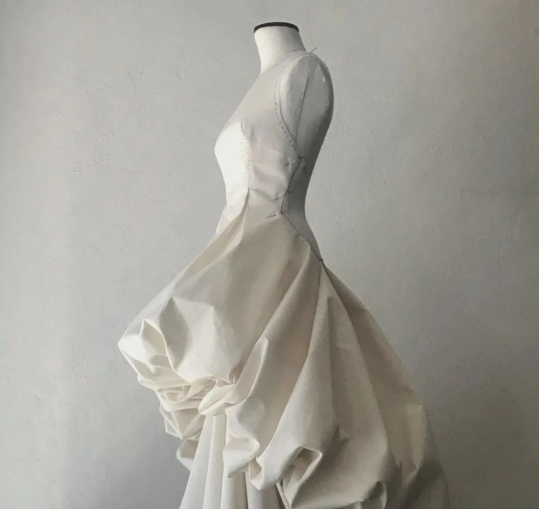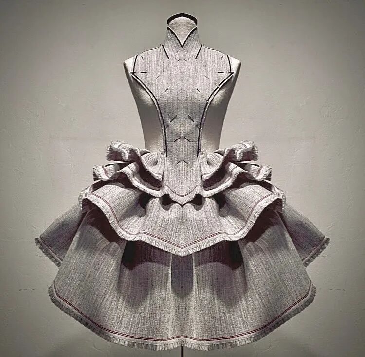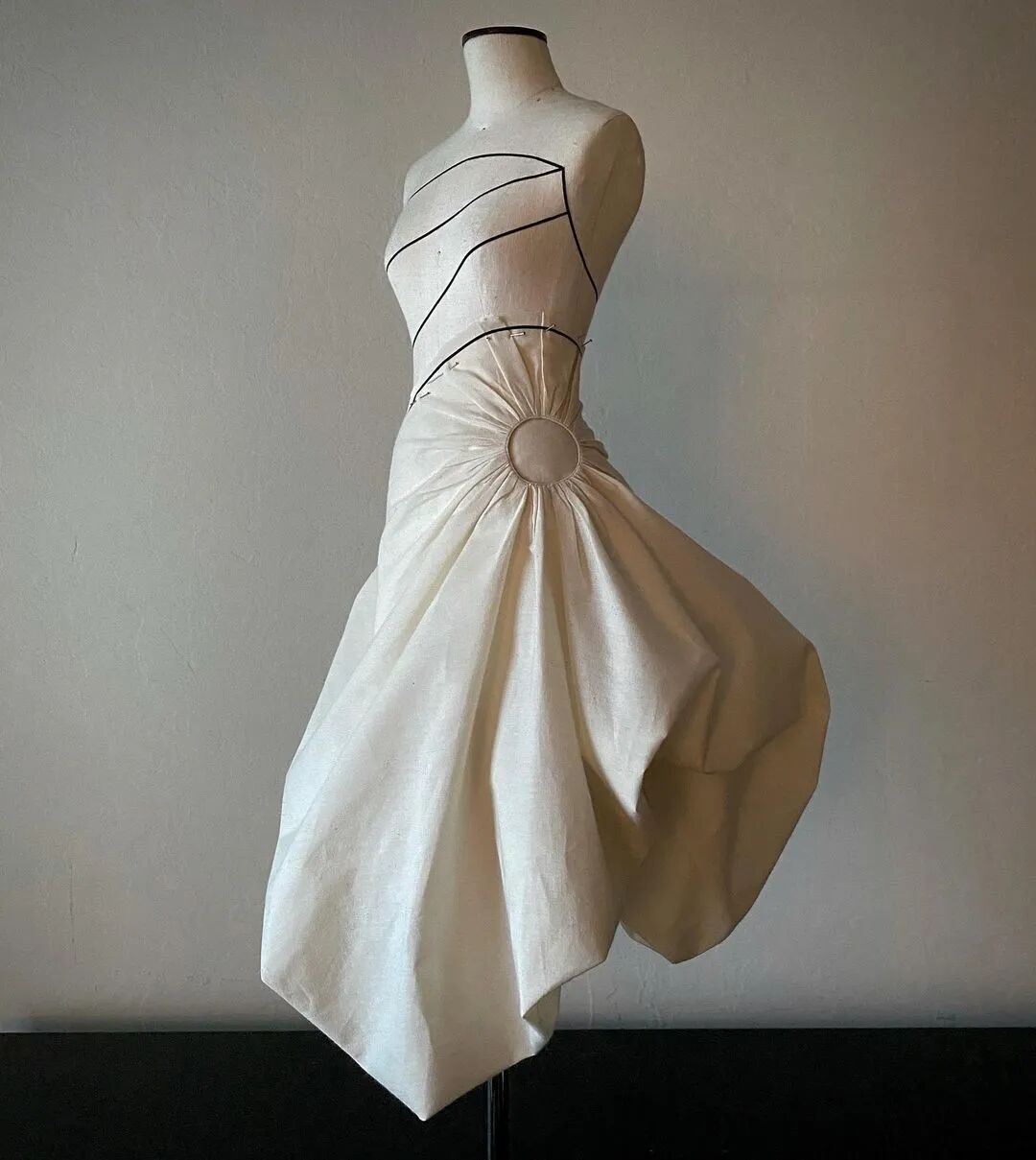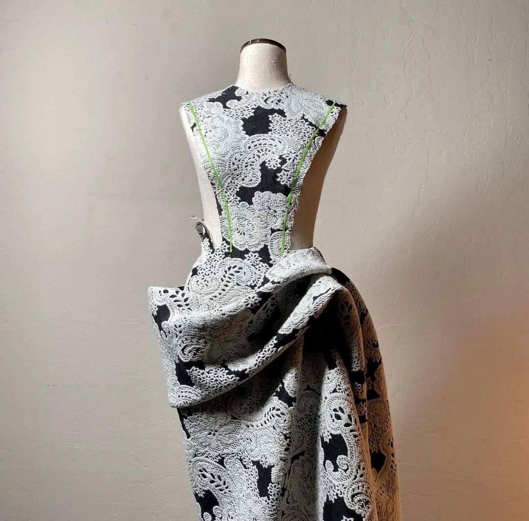 Rob Curry 非常喜欢3D立裁结构设计,他的设计灵感也往往来自于此。不同于其他设计师的是,身为一位立裁专家,他常常在人台上开始他的设计,有时也会从平面打板开始,Rob Curry 在设计时常常在牛皮纸与人台间来回转换,他立裁上的印花都是与 Simon Ungless 合作完成的。