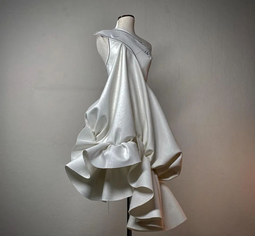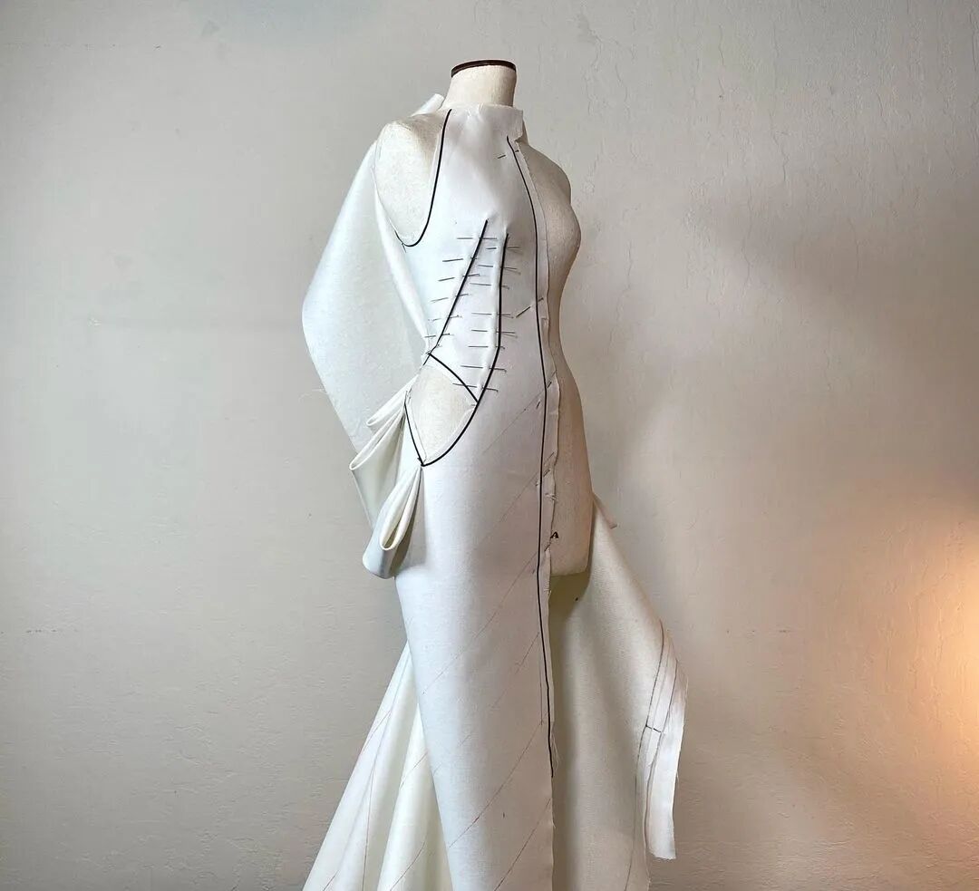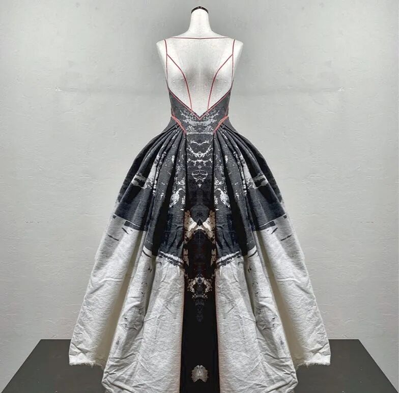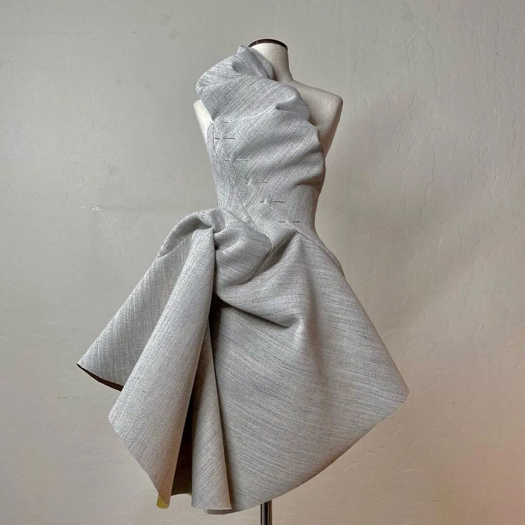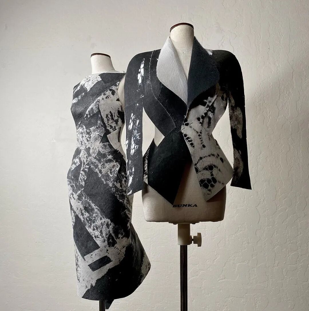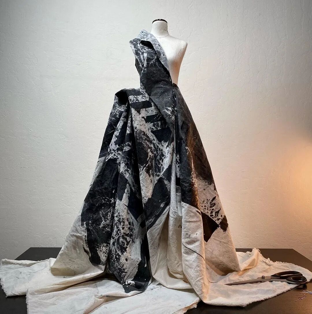 Rob Curry 非常喜欢3D立裁结构设计,他的设计灵感也往往来自于此。不同于其他设计师的是,身为一位立裁专家,他常常在人台上开始他的设计,有时也会从平面打板开始,Rob Curry 在设计时常常在牛皮纸与人台间来回转换,他立裁上的印花都是与 Simon Ungless 合作完成的。