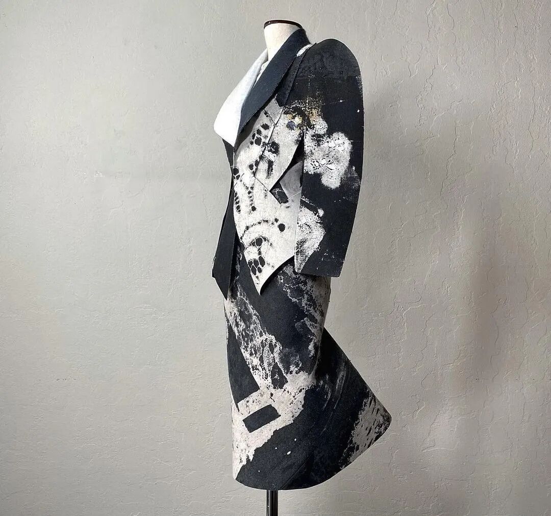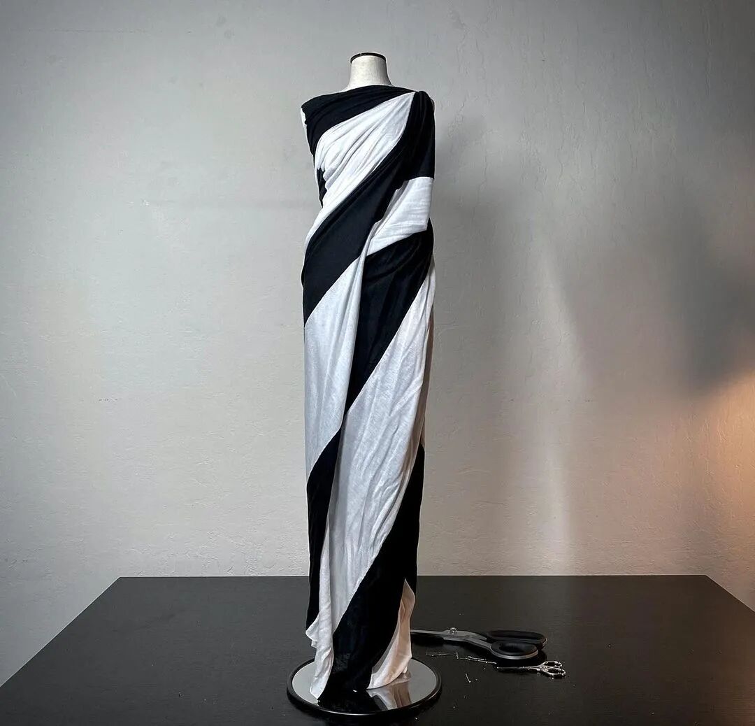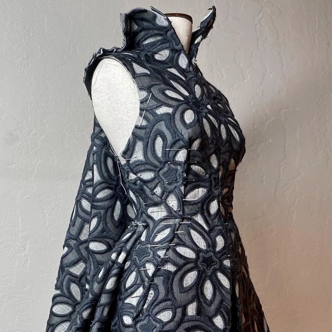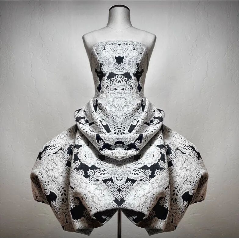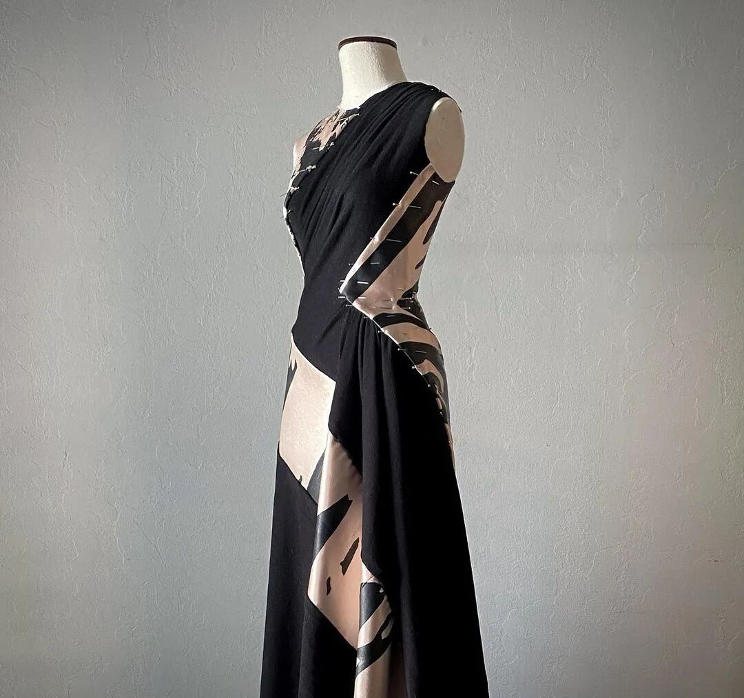 Rob Curry 非常喜欢3D立裁结构设计,他的设计灵感也往往来自于此。不同于其他设计师的是,身为一位立裁专家,他常常在人台上开始他的设计,有时也会从平面打板开始,Rob Curry 在设计时常常在牛皮纸与人台间来回转换,他立裁上的印花都是与 Simon Ungless 合作完成的。