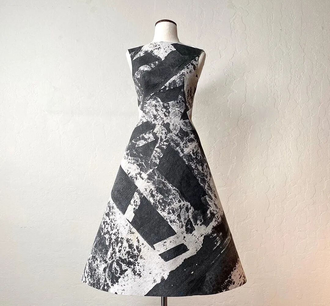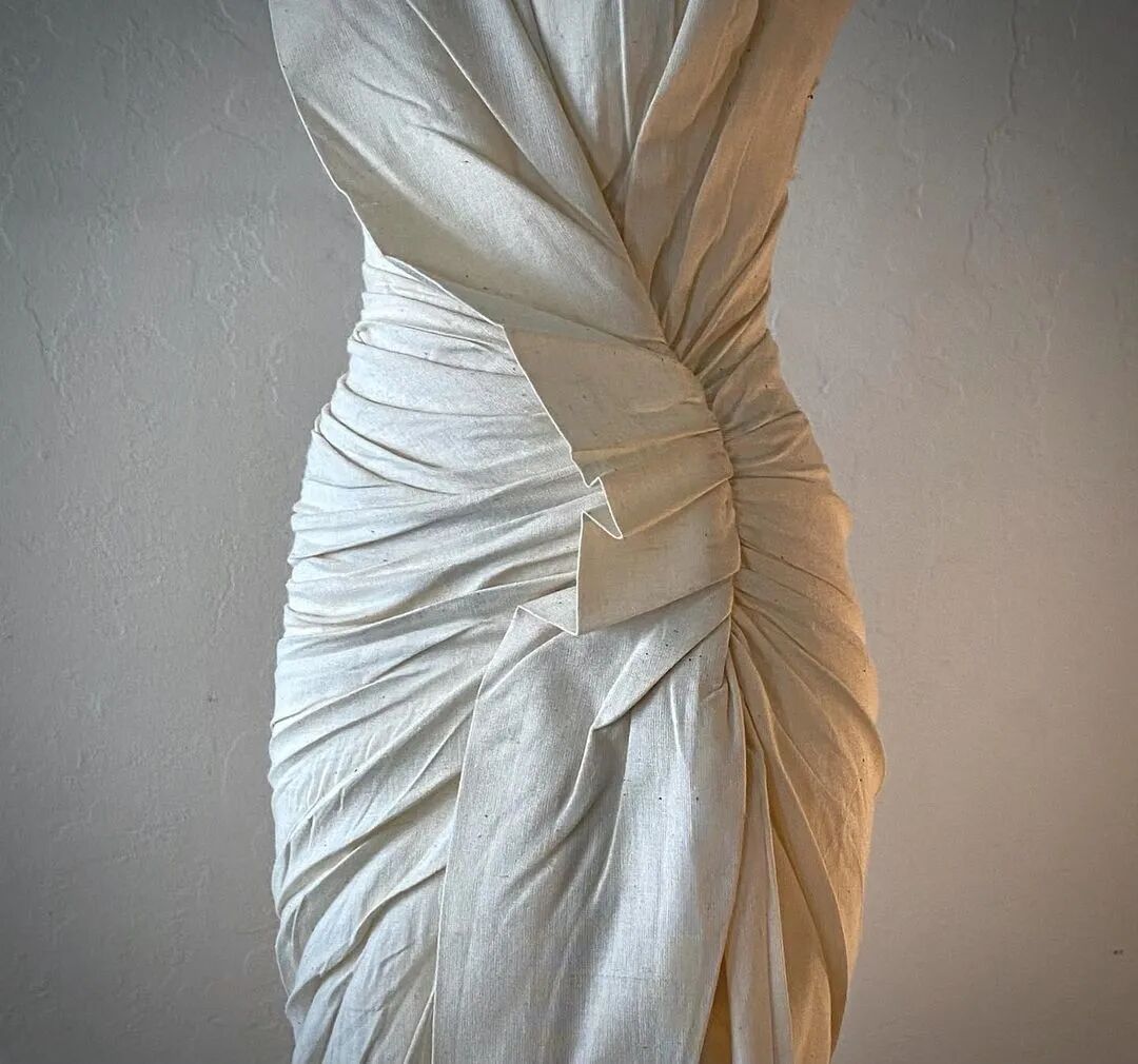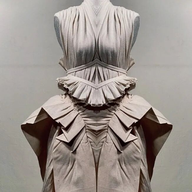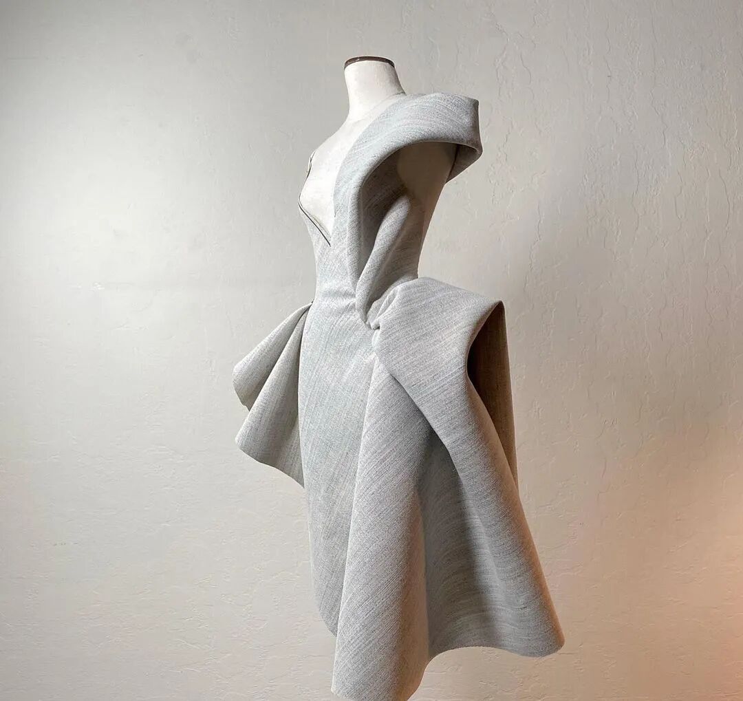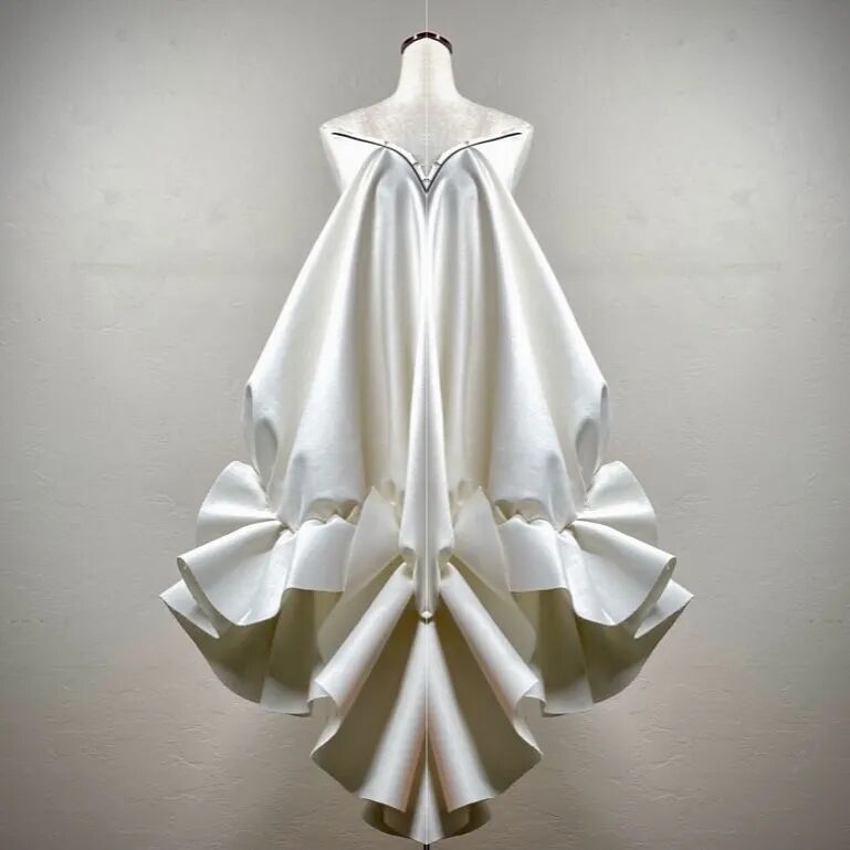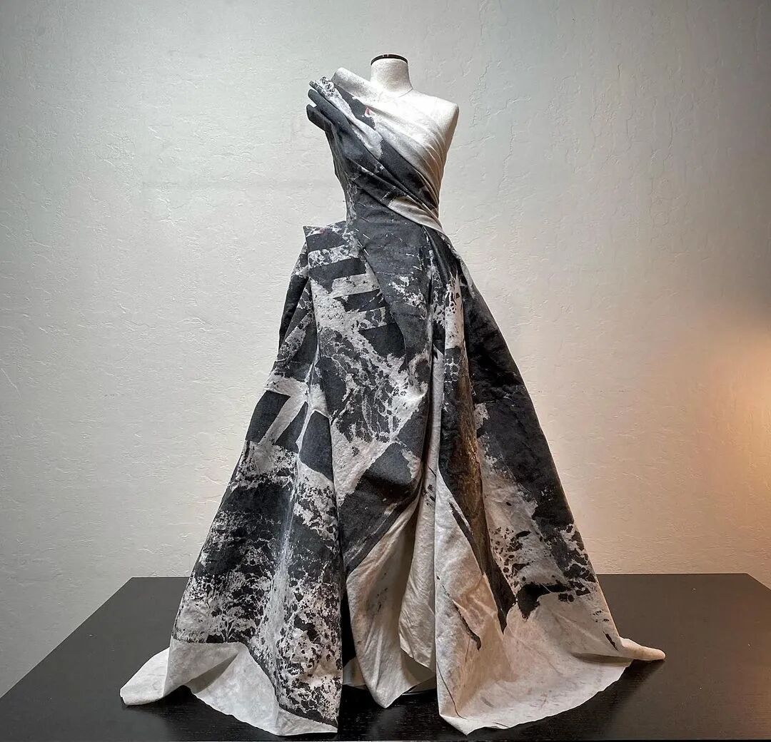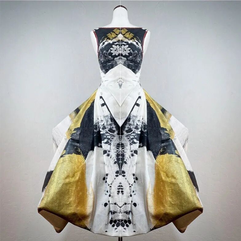 Rob Curry 非常喜欢3D立裁结构设计,他的设计灵感也往往来自于此。不同于其他设计师的是,身为一位立裁专家,他常常在人台上开始他的设计,有时也会从平面打板开始,Rob Curry 在设计时常常在牛皮纸与人台间来回转换,他立裁上的印花都是与 Simon Ungless 合作完成的。
