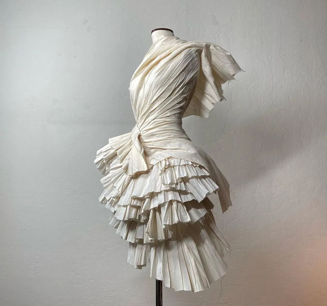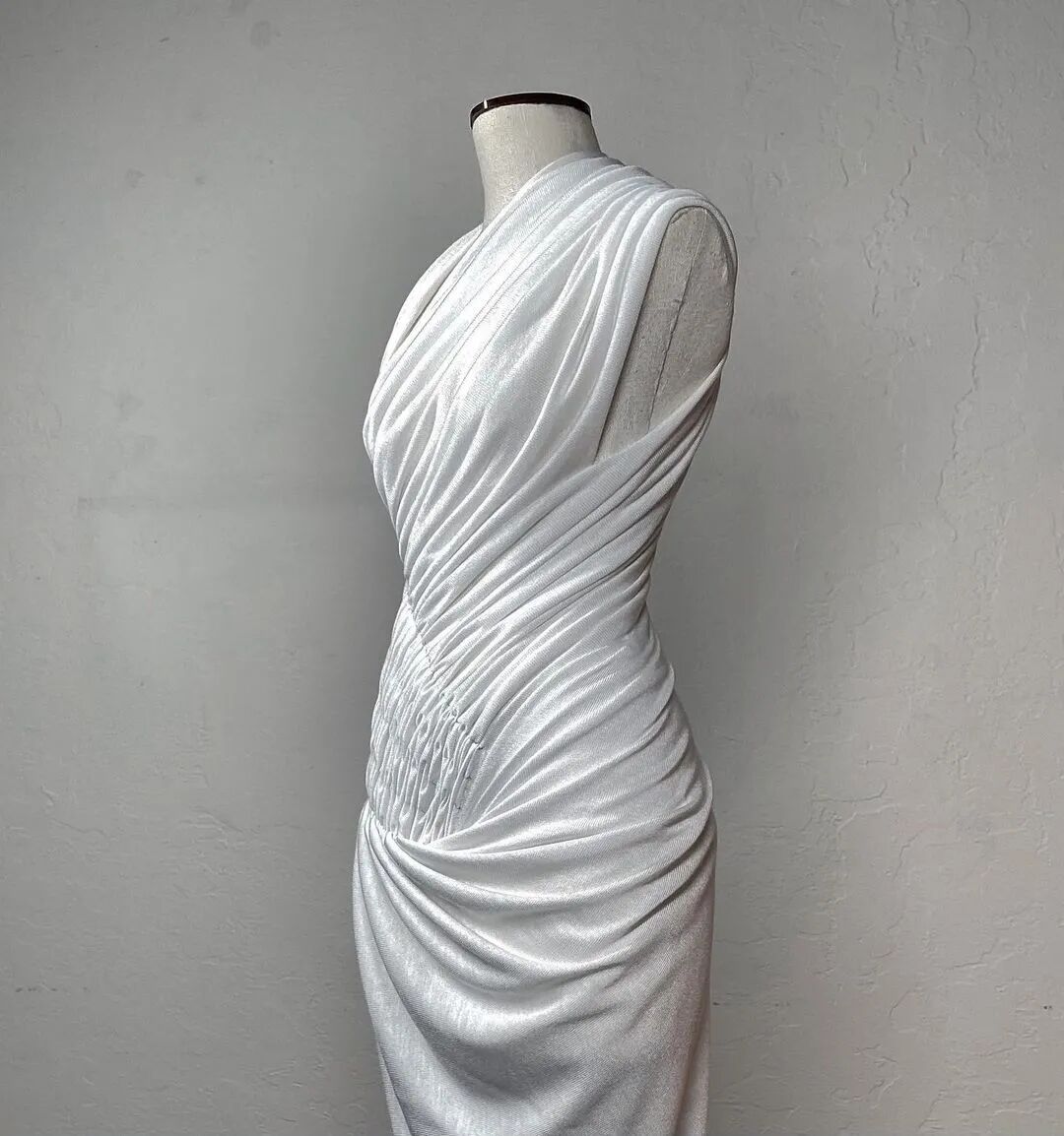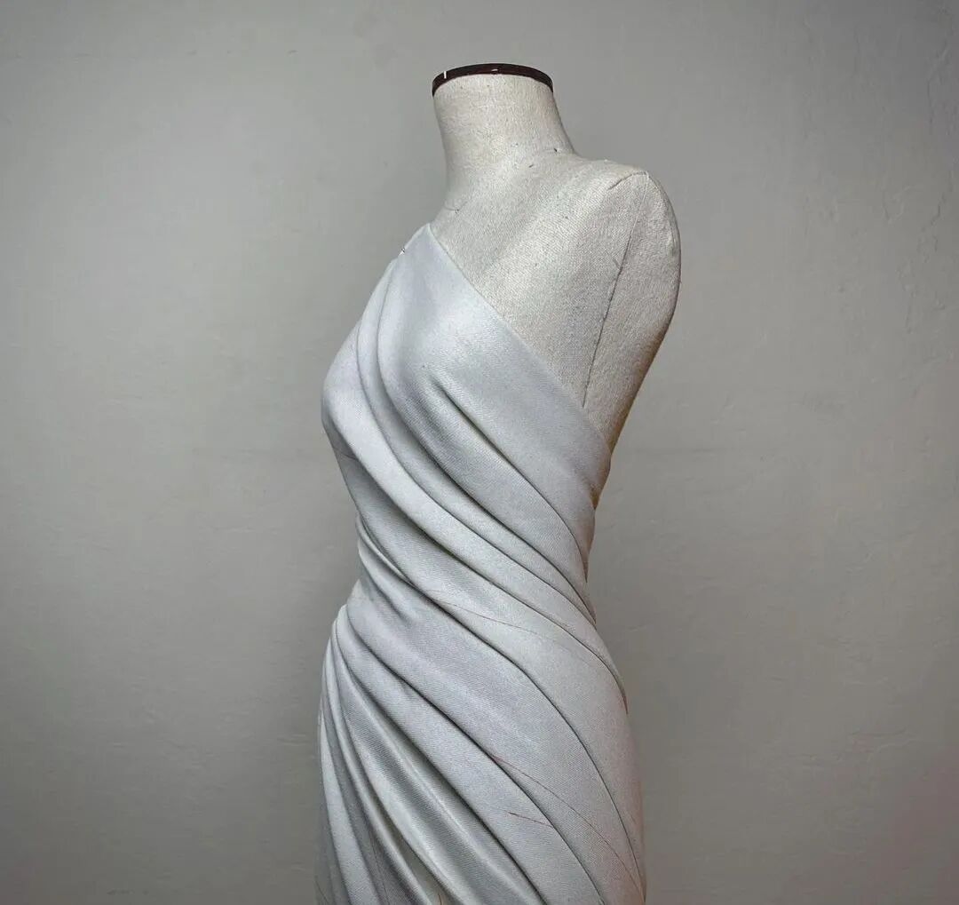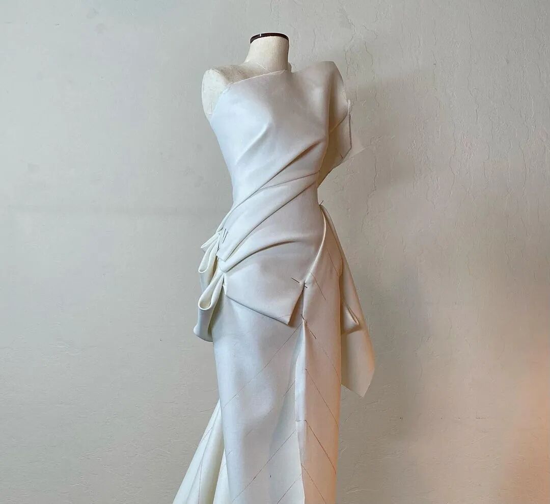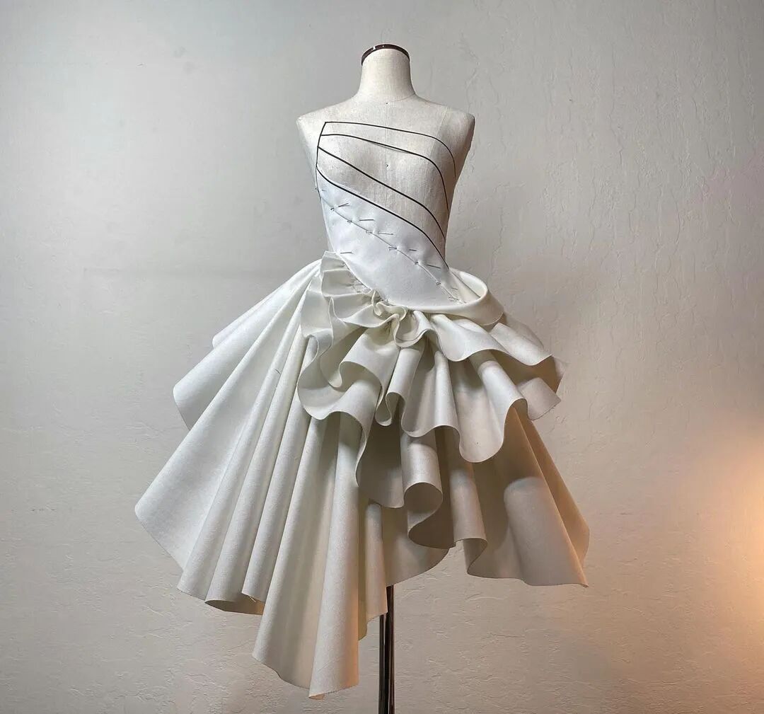 Rob Curry 非常喜欢3D立裁结构设计,他的设计灵感也往往来自于此。不同于其他设计师的是,身为一位立裁专家,他常常在人台上开始他的设计,有时也会从平面打板开始,Rob Curry 在设计时常常在牛皮纸与人台间来回转换,他立裁上的印花都是与 Simon Ungless 合作完成的。