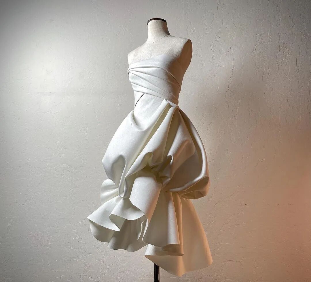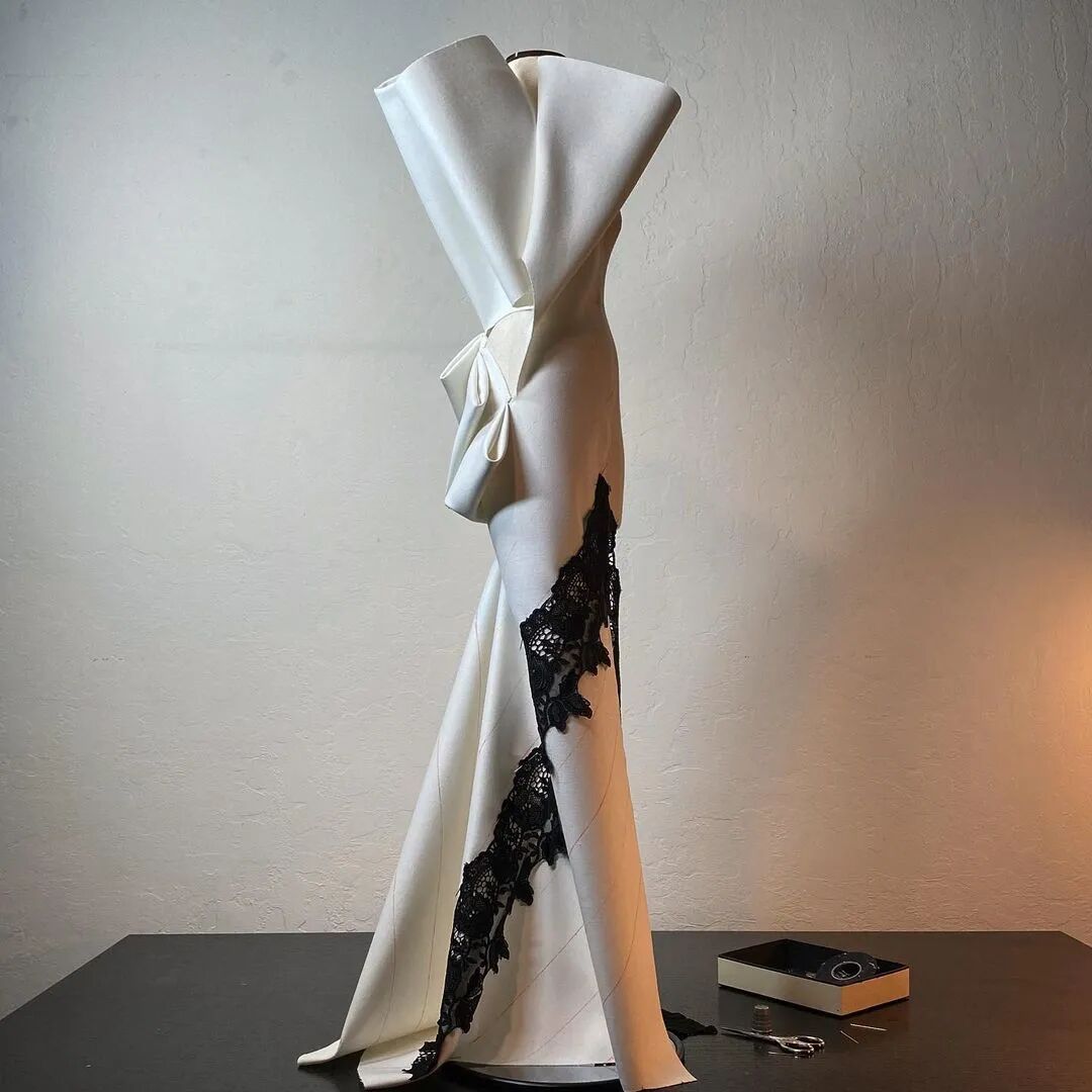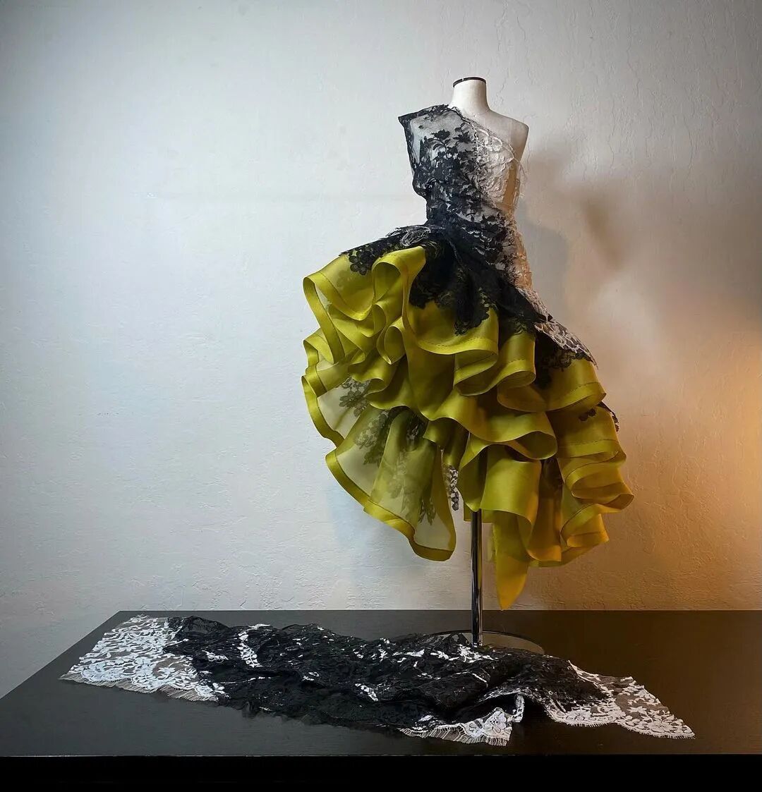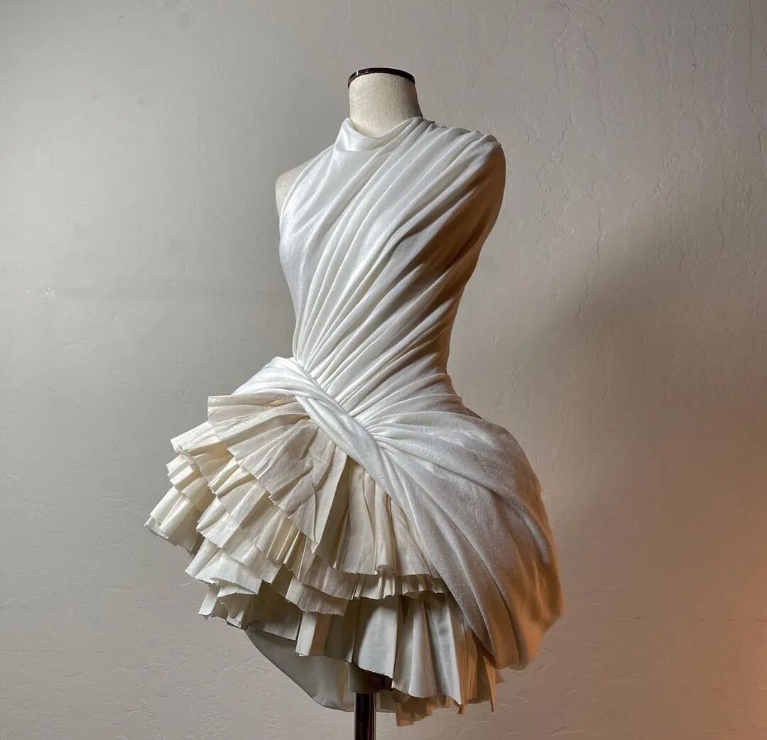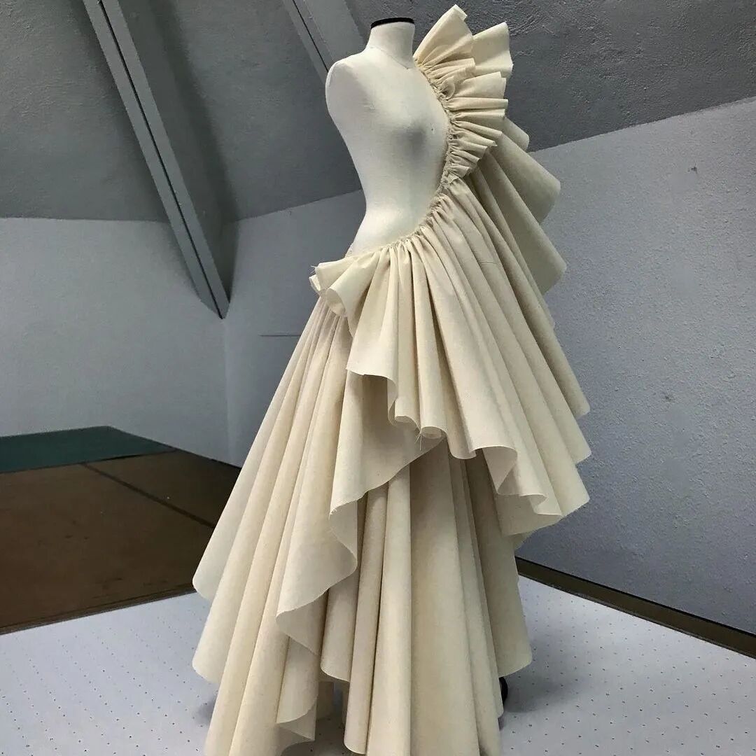 Rob Curry 非常喜欢3D立裁结构设计,他的设计灵感也往往来自于此。不同于其他设计师的是,身为一位立裁专家,他常常在人台上开始他的设计,有时也会从平面打板开始,Rob Curry 在设计时常常在牛皮纸与人台间来回转换,他立裁上的印花都是与 Simon Ungless 合作完成的。