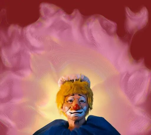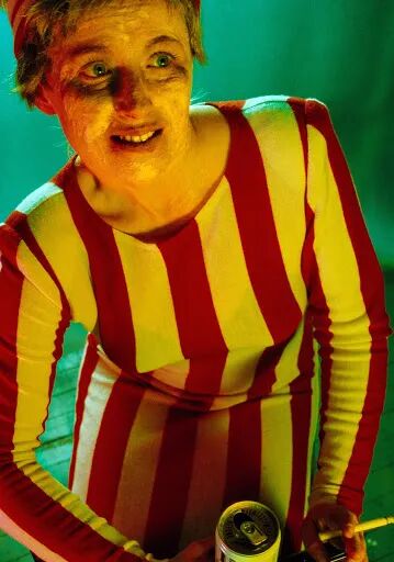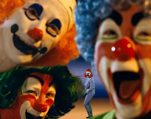 该系列作品中,舍曼将自己扮演为浓妆艳抹、表情夸张丰富的小丑形象。“小丑”本身是一个非常丰富复杂的符号形象,快乐、童年、消遣,但也是面具、畸形、悲伤.......