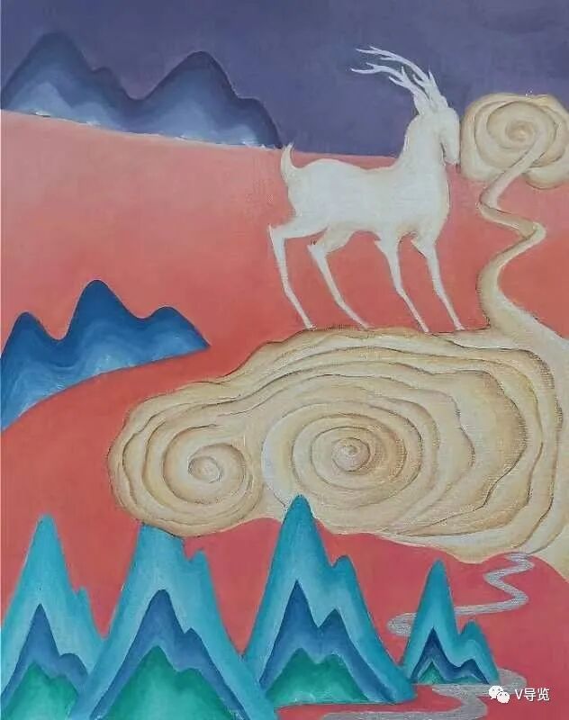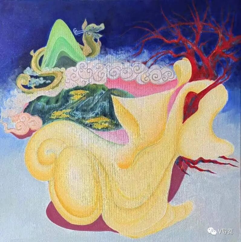 第二张作品:本幅作品尝试用风格来引导观看者的视觉,通过一种敦煌纹饰范式来描绘诗词中使人描绘的浪漫主义景象,同时通过另一种比较现实的方式来描绘诗人肉身所处的世俗世界。通过两种不同风格的强烈对比,通过视觉的深层归纳的能力,人为地分割观看者对描绘在同一张画布上的不同元素的理解范围,从而达到一种新的视觉传达的效果。