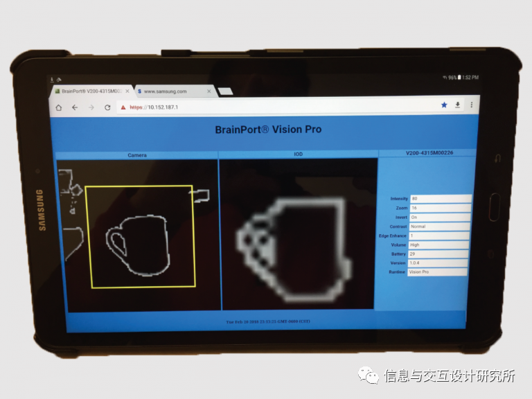 该摄像机可在各种照明条件下工作,并具有可调节的视野。舌阵列包含 394 个电极,通过柔性电缆连接到耳机,因此耳机不会掉落和丢失。使用时,来自相机的白色像素在舌头上被感觉到强烈的刺激,黑色像素作为无刺激,灰度级作为中等水平的刺激。