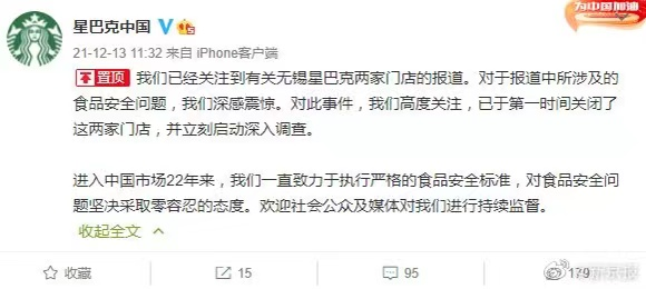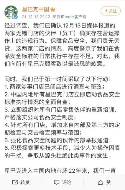 几分钟后,星巴克中国再次发微博,这回是致歉,承认确实存在调查中指出的问题,并列举出了采取的措施,如强化内部举报通报、组织重新培训等,当然,末了不忘再重申一遍那句话:进入中国22年来,我们一直将食品安全放在首位……